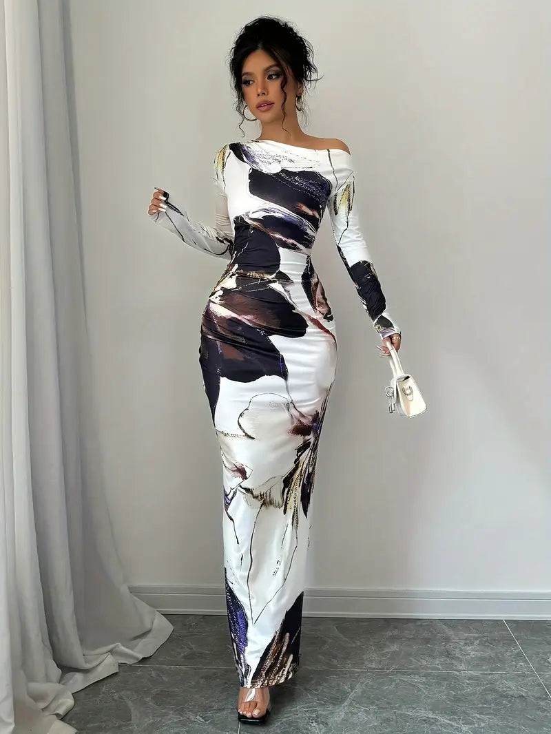 Questo elegante maxi abito a maniche lunghe presenta una stampa astratta su una miscela liscia ed elastica di tessuto di alta qualità ed elastan per una vestibilità bodycon.