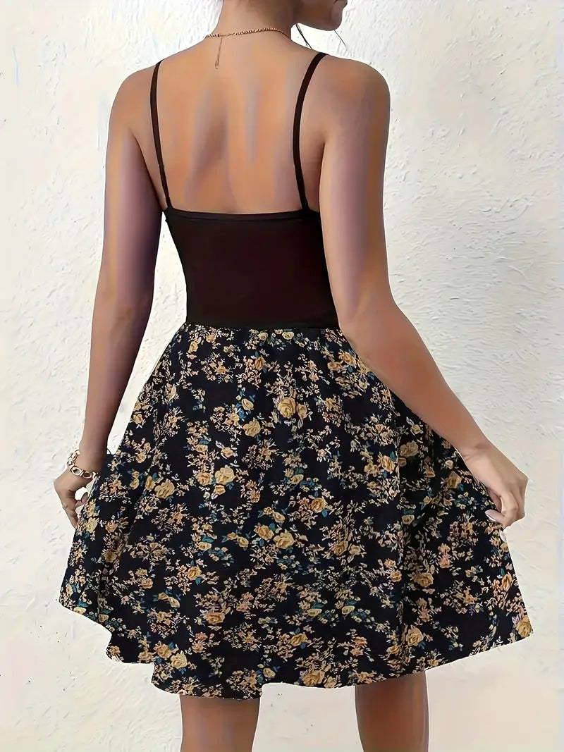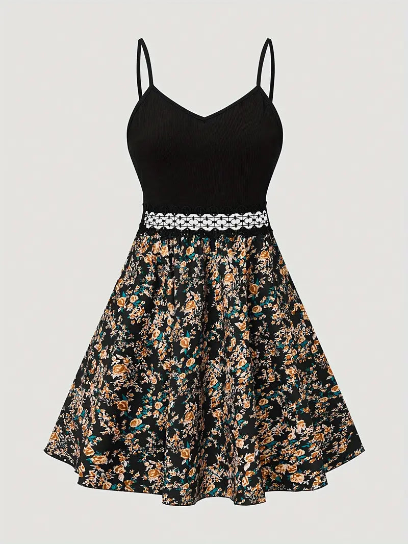 Questo abito è così carino e perfetto per l'estate! Ha un top nero a coste in stile canotta con spalline, che gli conferisce un'atmosfera elegante e civettuola, mentre la gonna si svasa in un'ariosa linea ad A ricoperta da una delicata stampa floreale, per lo più in gialli e blu tenui su sfondo scuro. La fascia all'uncinetto in vita è un altro dolce dettaglio che aggiunge fascino e definisce il punto vita.