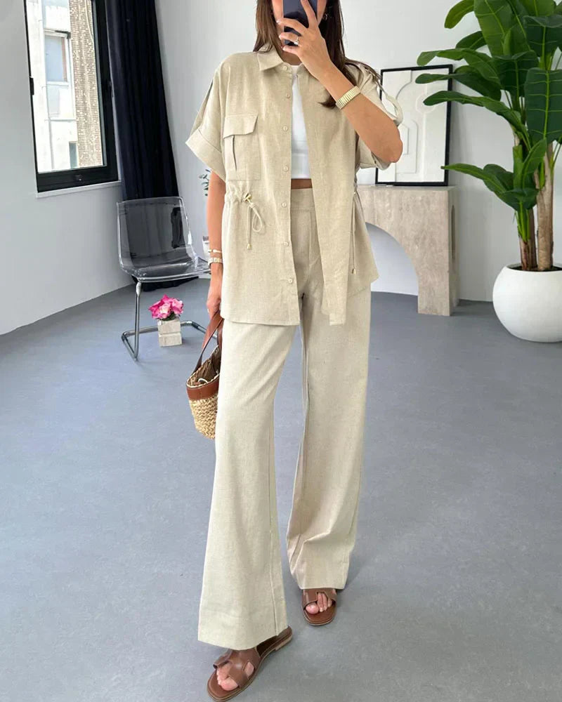 I pantaloni fluidi offrono una silhouette elegante e allo stesso tempo sono traspiranti e casual, perfetti per le giornate calde. Disponibile nei toni della terra come il verde oliva, il classico blu navy e il morbido beige, questo completo è la scelta ideale per le uscite casual, i brunch o i viaggi in cui stile e comfort vanno di pari passo.