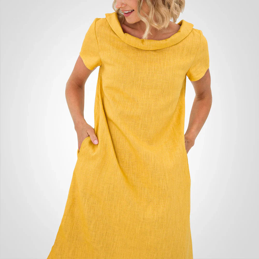 Realizzato in misto cotone e lino traspirante, questo abito casual dalla linea ad A è elegante e confortevole e si drappeggia magnificamente. La morbida scollatura a barchetta aggiunge un tocco sofisticato, mentre le maniche corte e la silhouette ampia lo rendono perfetto per essere indossato tutti i giorni.