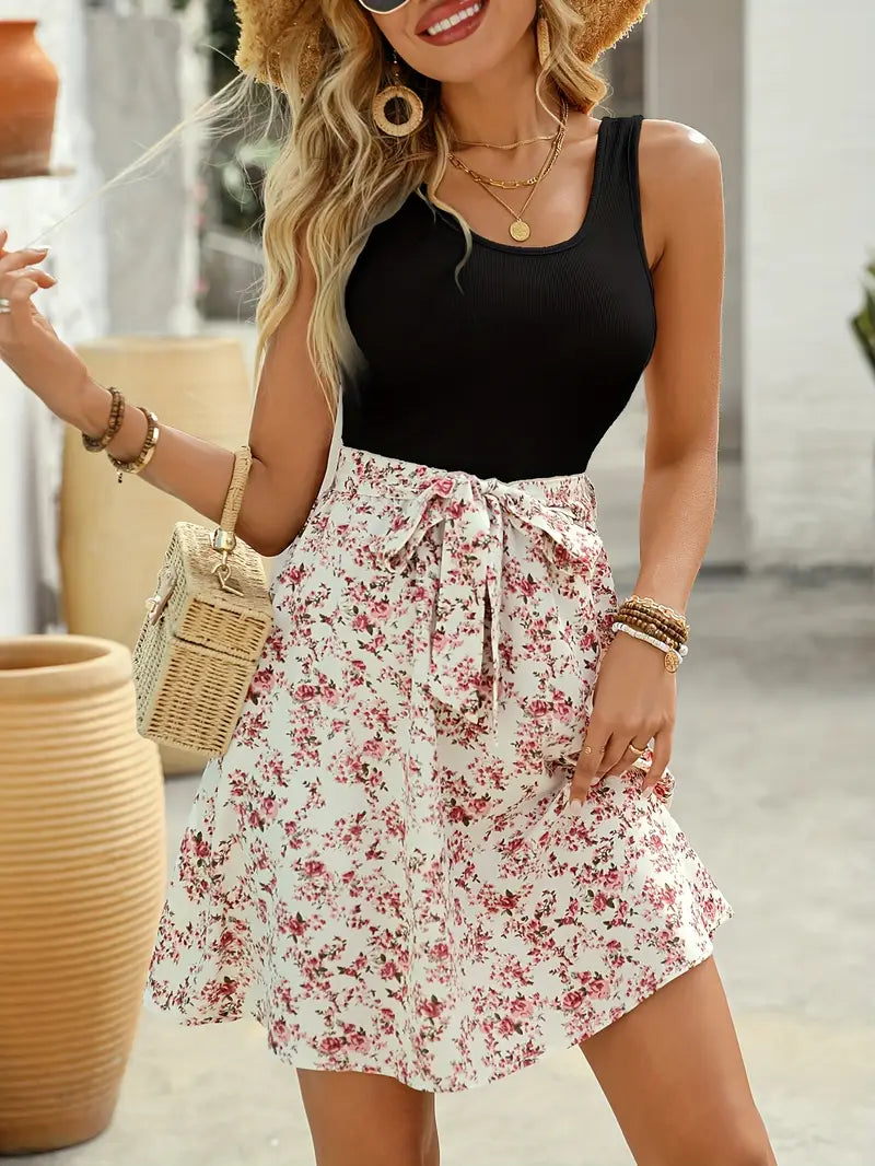 Questi abiti sono assolutamente adorabili e così estivi! Hanno un perfetto look bicolore: un top a tinta unita a coste in diversi colori abbinato a una gonna fluida con stampa floreale in bianco e rosso.