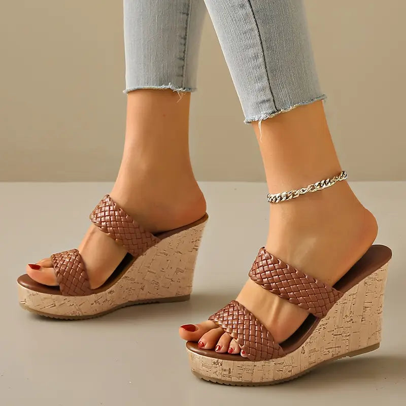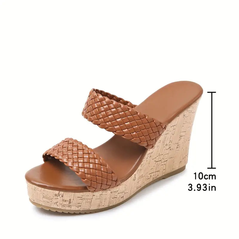 Date un tocco di classe al vostro look con questi eleganti sandali con zeppa in sughero, progettati per garantire comfort e impatto . Caratterizzati da doppi cinturini in ecopelle intrecciata per una calzata sicura ma chic, questi sandali con zeppa slip-on offrono un'elevazione lusinghiera con un alto tacco a zeppa in sughero.