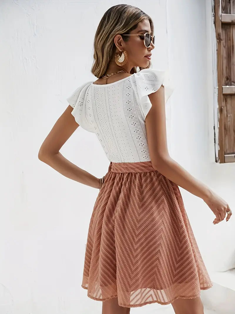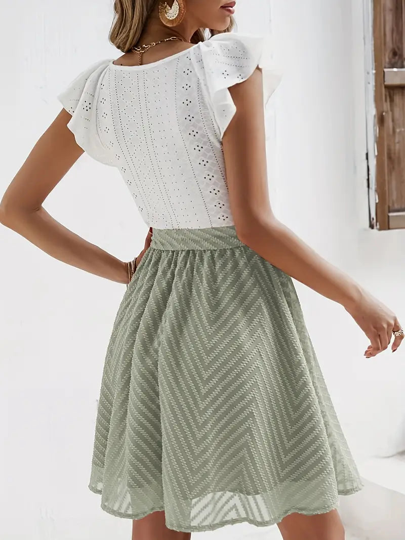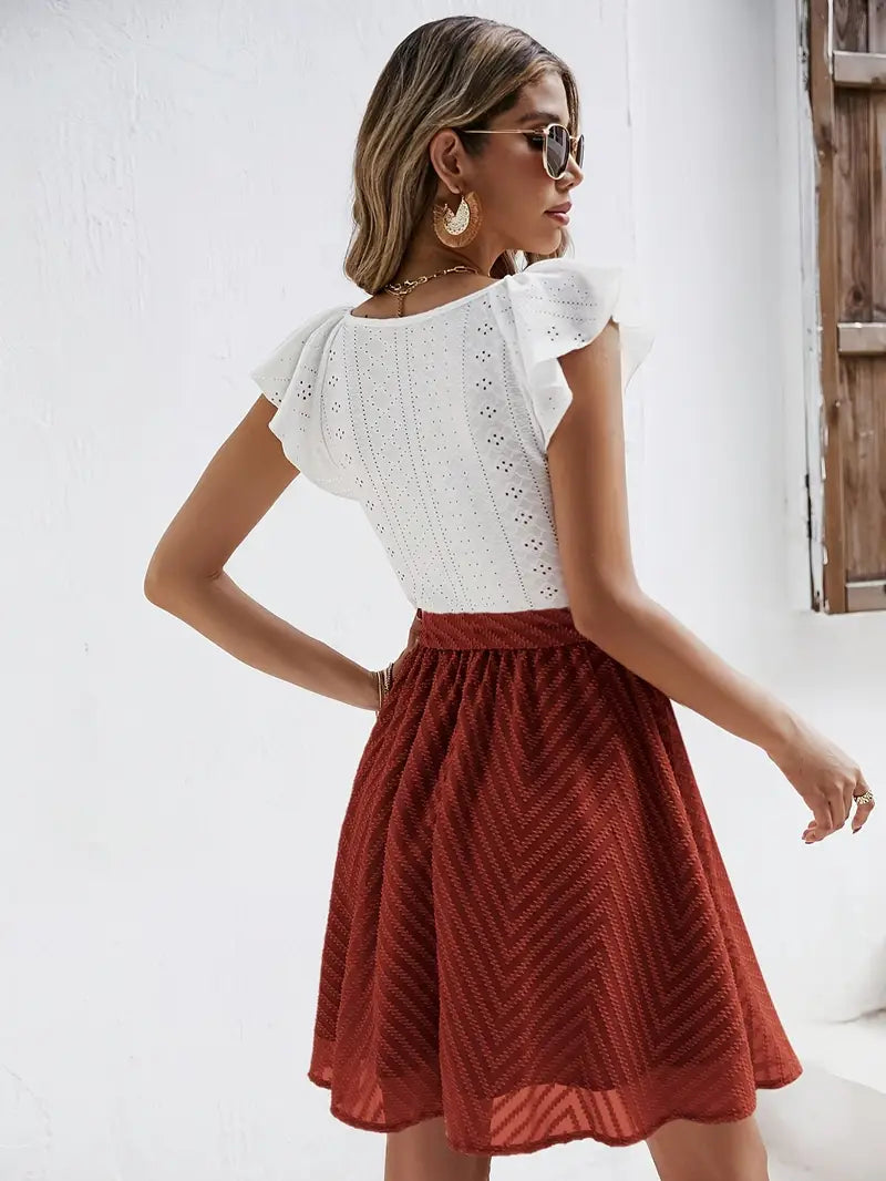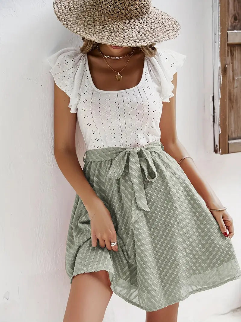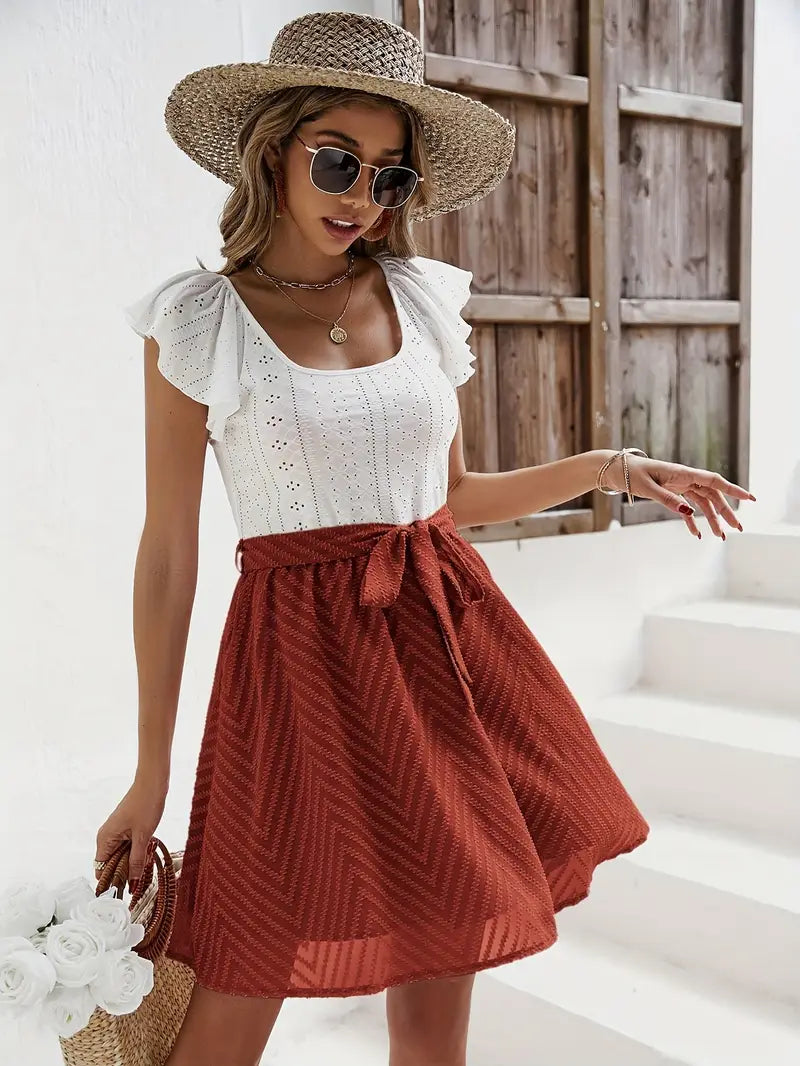 L'estate è senza sforzo con questo abito elegante e femminile, caratterizzato da un corpetto in eyelet bianco con maniche svolazzanti e scollatura quadrata . La gonna a vita alta si allarga ad A e si chiude in vita con una cintura da annodare per dare un tocco di definizione.