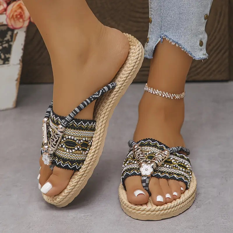Questi sandali in corda intrecciata con perline di Boemia, splendidamente realizzati, vi faranno viaggiare senza sforzo quest'estate. I sandali sono dotati di una resistente suola in corda intrecciata che offre comfort e flessibilità, perfetti per le avventure nella stagione calda.