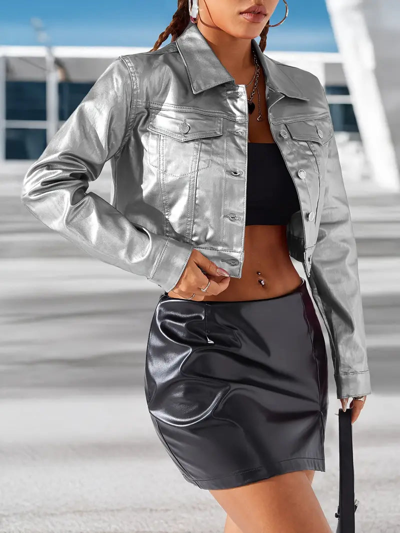 Questa giacca cropped metallizzata è una dichiarazione audace per un look futuristico e tagliente. Realizzata in tessuto lucido e brillante, presenta un design strutturato con classiche chiusure a bottoni, tasche sul petto e colletto a punta.