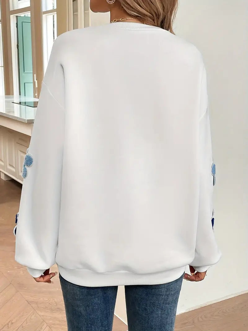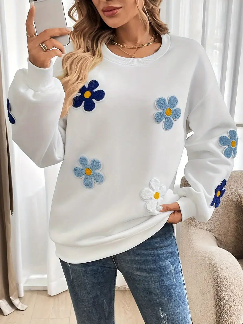 Questa felpa giocosa in morbido tessuto di misto cotone con applicazioni floreali colorate e strutturate crea un look vivace e allegro. Con la sua vestibilità ampia e i polsini a coste, offre comfort e stile per l'abbigliamento quotidiano.