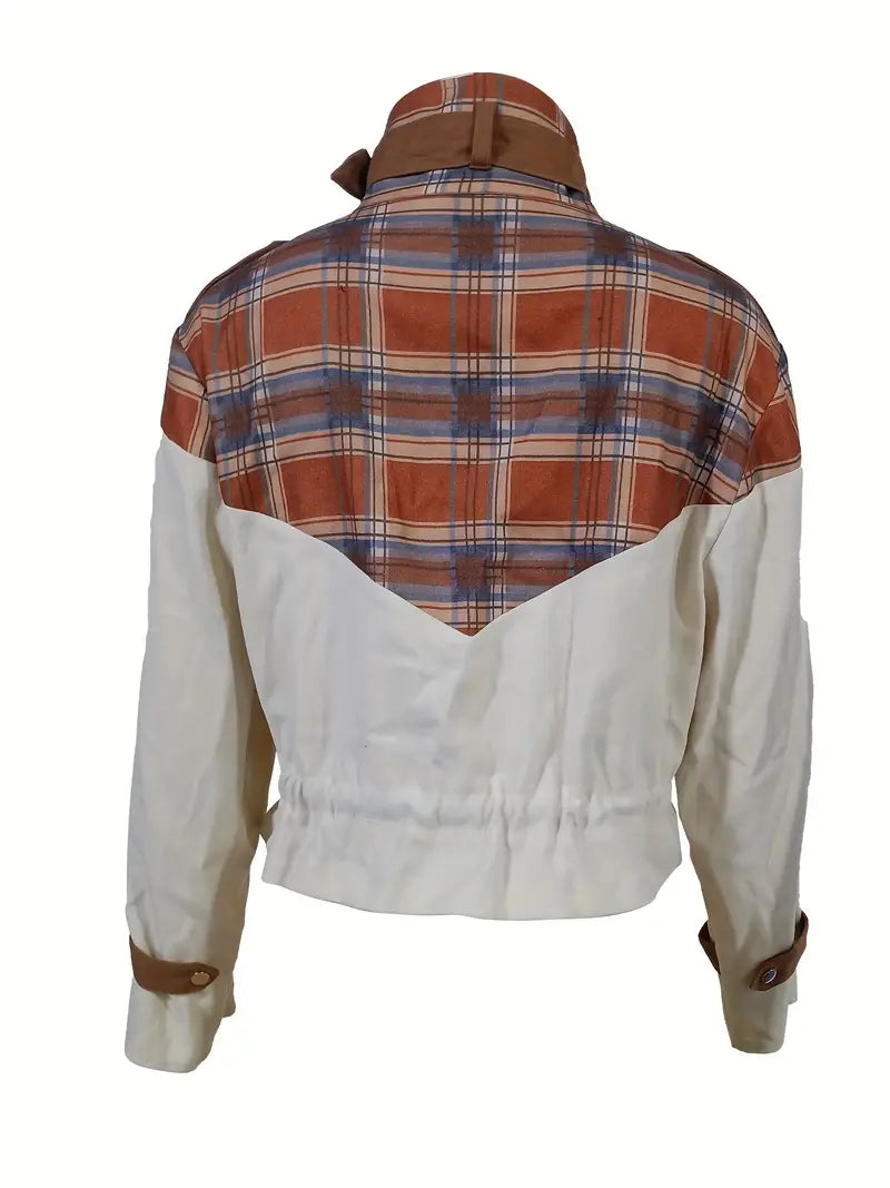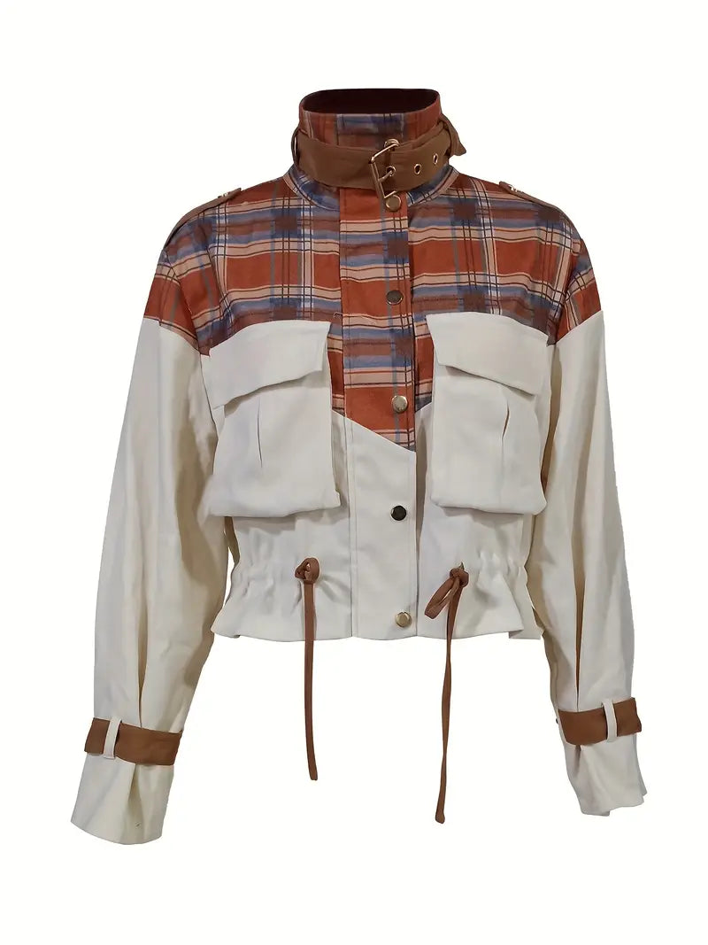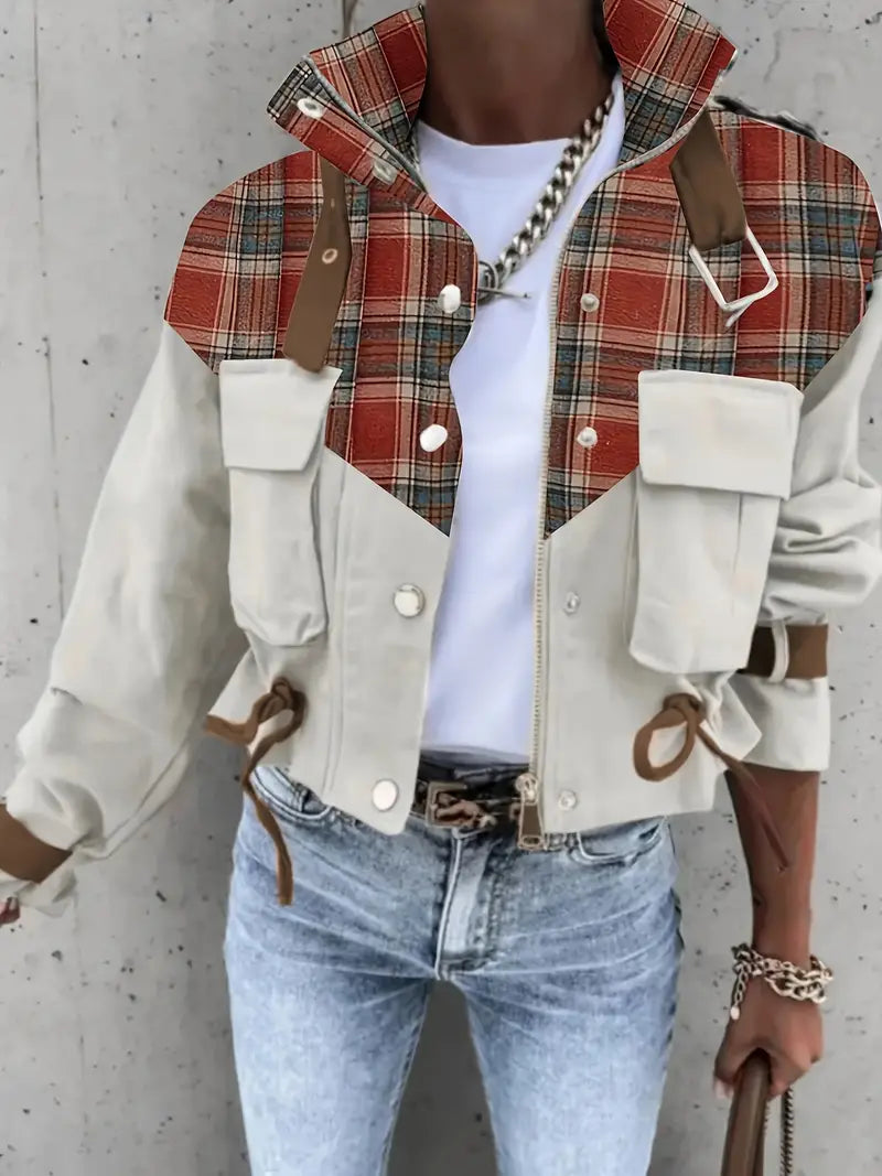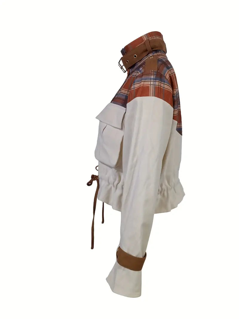 Questa giacca corta unica combina l'utilità moderna con il fascino rustico. Realizzata in una combinazione di tela di cotone e flanella a quadri, offre resistenza e calore. Il corpo di colore beige è completato da vistosi dettagli a quadri sulle spalle e sul colletto , cui si aggiunge un tocco di tendenza con cinturini in pelle.