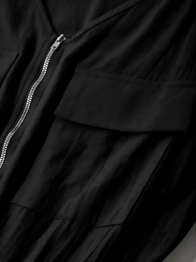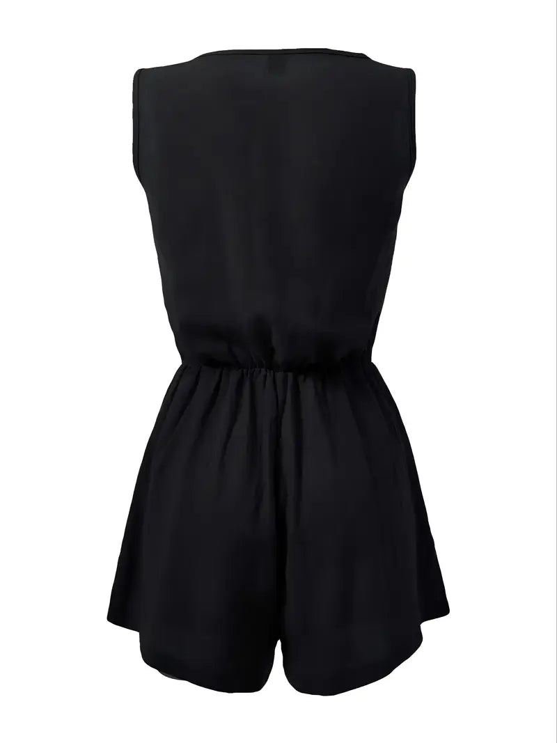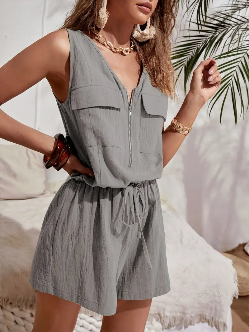 Dotato di chiusura a zip, tasche con patta sul petto e coulisse in vita, questo pagliaccetto senza maniche è elegante e senza sforzo. Il tessuto leggero e la vestibilità ampia sono perfetti per le giornate calde e offrono un comfort che dura tutto il giorno con un'atmosfera chic e minimalista.