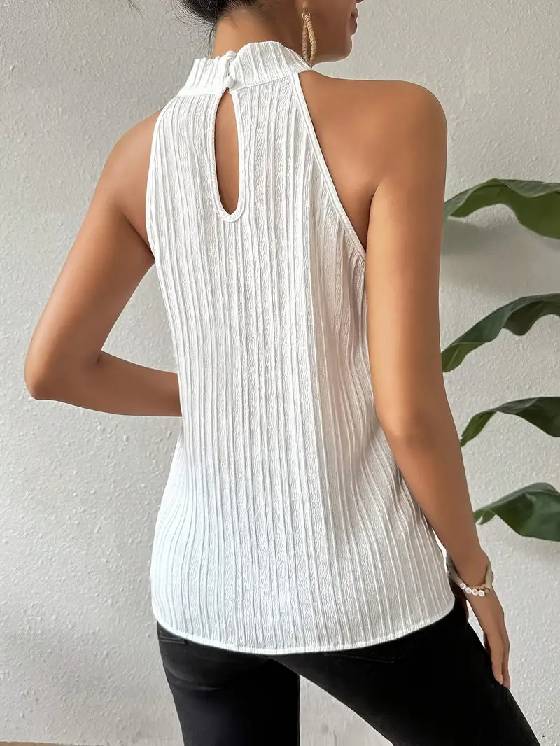 Questo top senza maniche con scollo all'americana è il mix perfetto tra eleganza e fascino moderno. Con la sua chic struttura plissettata, cade meravigliosamente e crea una silhouette lusinghiera. Lo scollo alto gli conferisce un tocco sofisticato e lo rende ideale sia per le occasioni casual che per quelle eleganti.