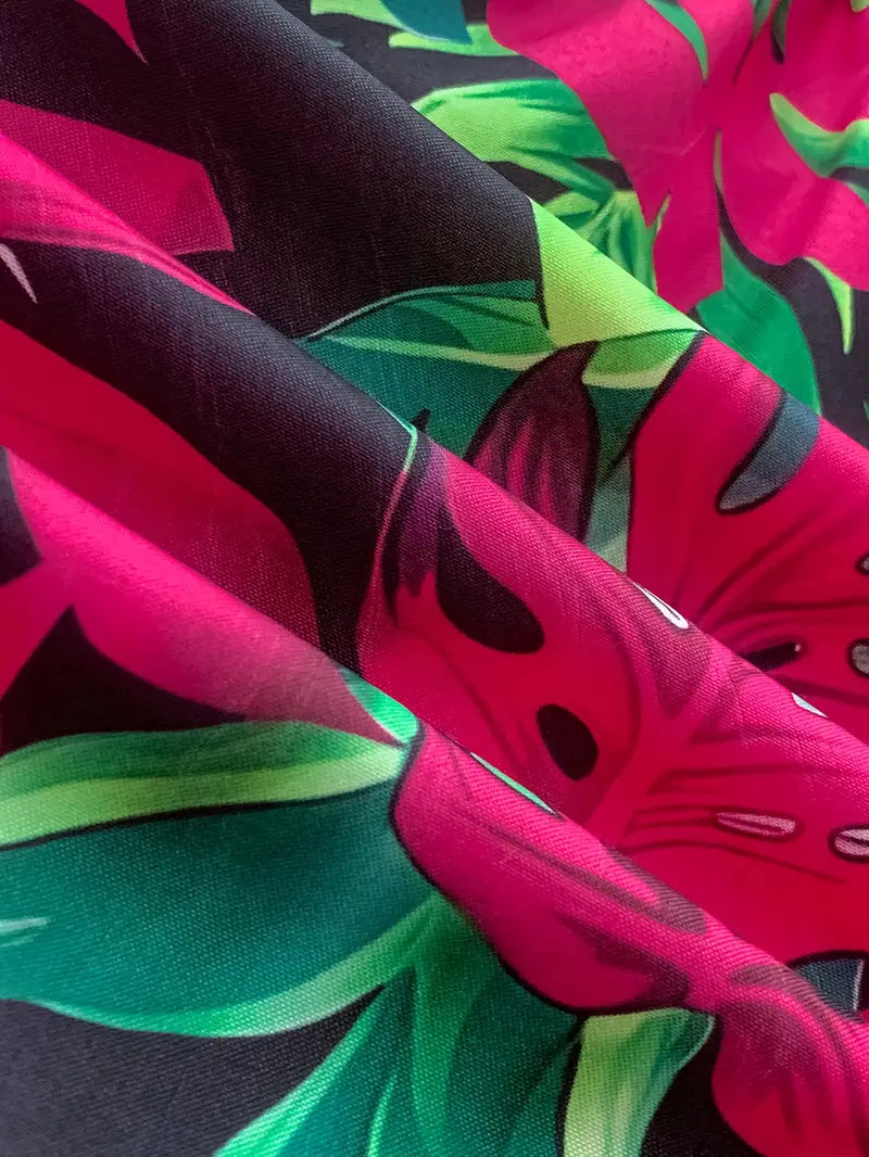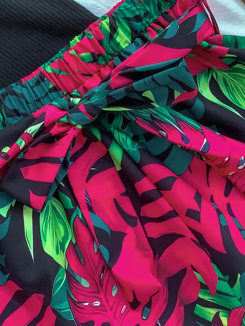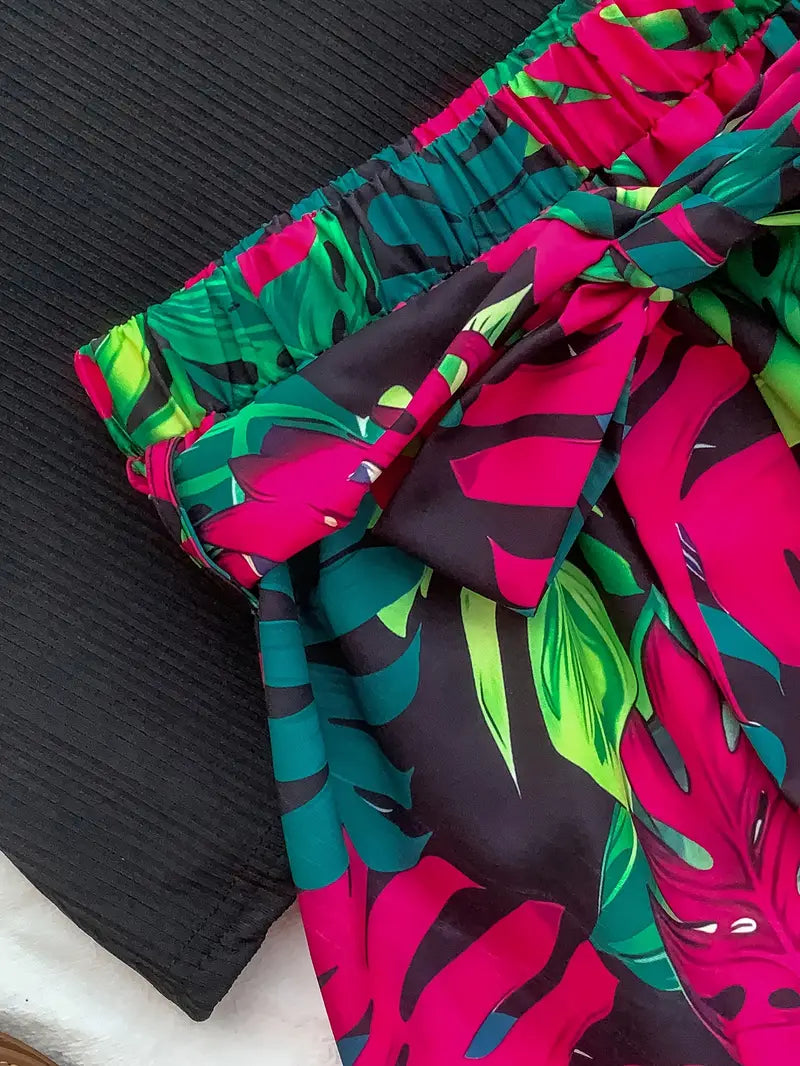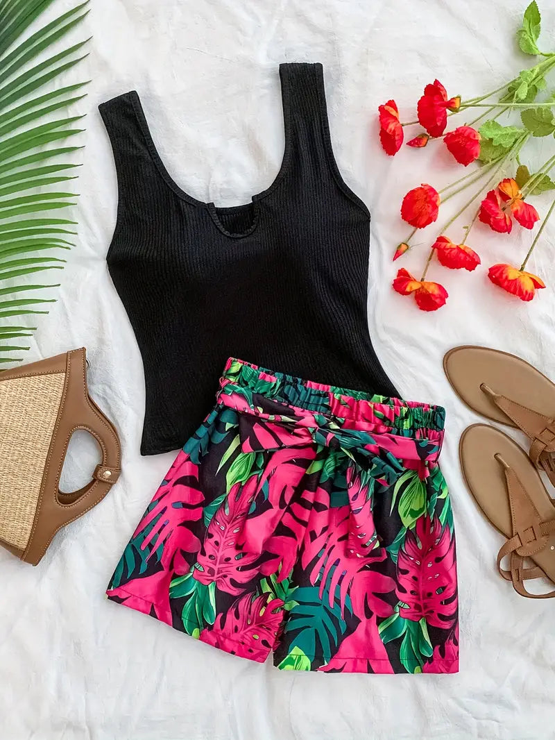 Il set Tropical Breeze è composto da un'elegante canotta nera a costine, realizzata in misto cotone morbido e traspirante, che si adatta al corpo con la giusta elasticità per garantire comfort e stile. Abbinato ai pantaloncini leggeri e di alta qualità con un'accattivante stampa tropicale, il completo offre colori brillanti che rimangono vivi anche dopo diversi lavaggi.