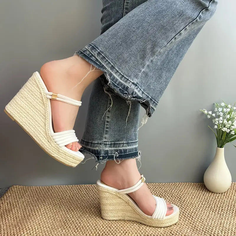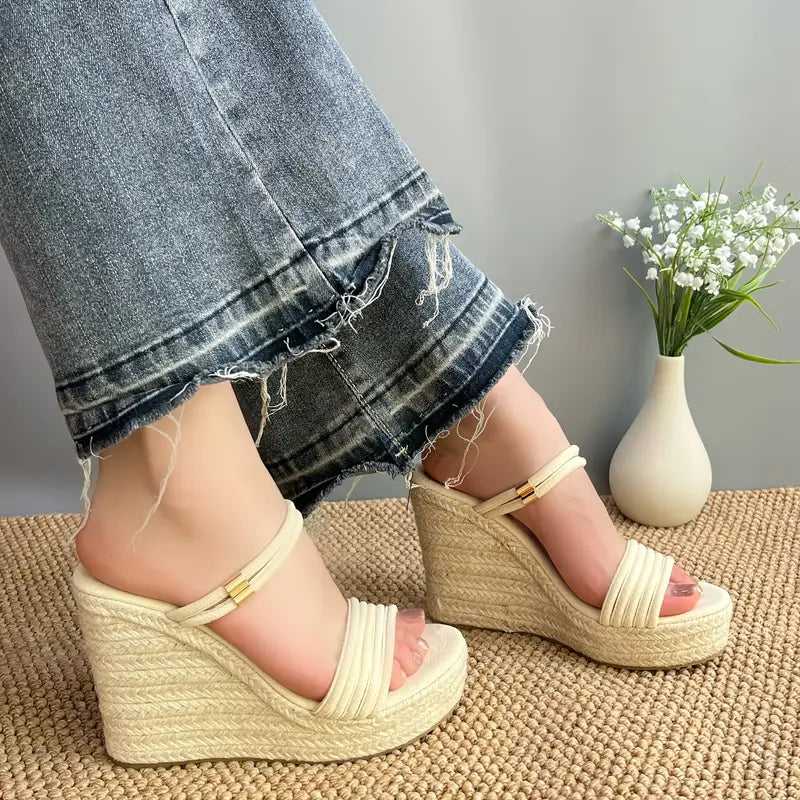 Diese Stroh-Keilsandalen verleihen Ihnen mühelos Höhe und sommerlichen Charme, denn sie bieten Komfort und Glamour für jeden Tag. Mit einem gewebten Keilabsatz aus Jute und einem minimalistischen Doppelriemen-Obermaterial mit einer eleganten Knöchelschnalle bieten diese Sandalen einen luftigen Stil und einen sicheren Sitz.