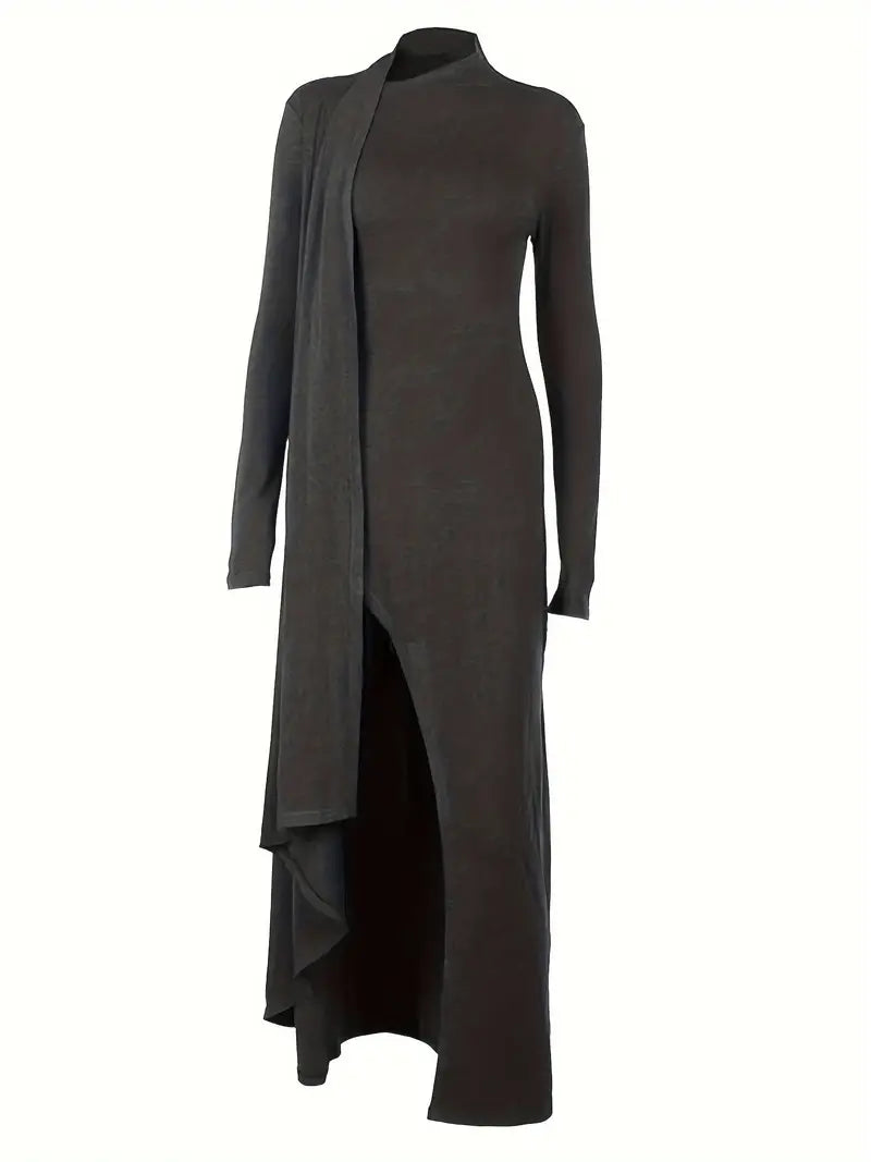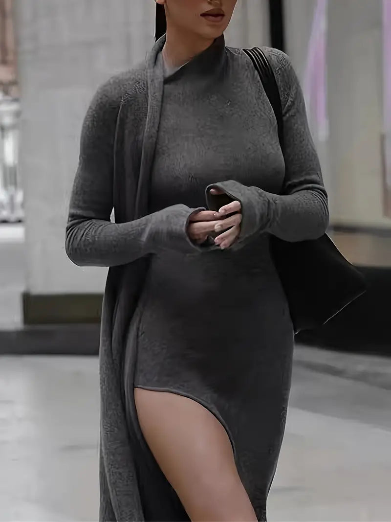 Questo sofisticato abito in maglia grigia offre una vestibilità sottile e aderente al corpo in un tessuto misto morbido ed elastico che garantisce comfort e una silhouette perfetta. Con il suo spacco asimmetrico all'altezza delle cosce e le estremità delle maniche allungate, questo abito unisce eleganza e modernità.