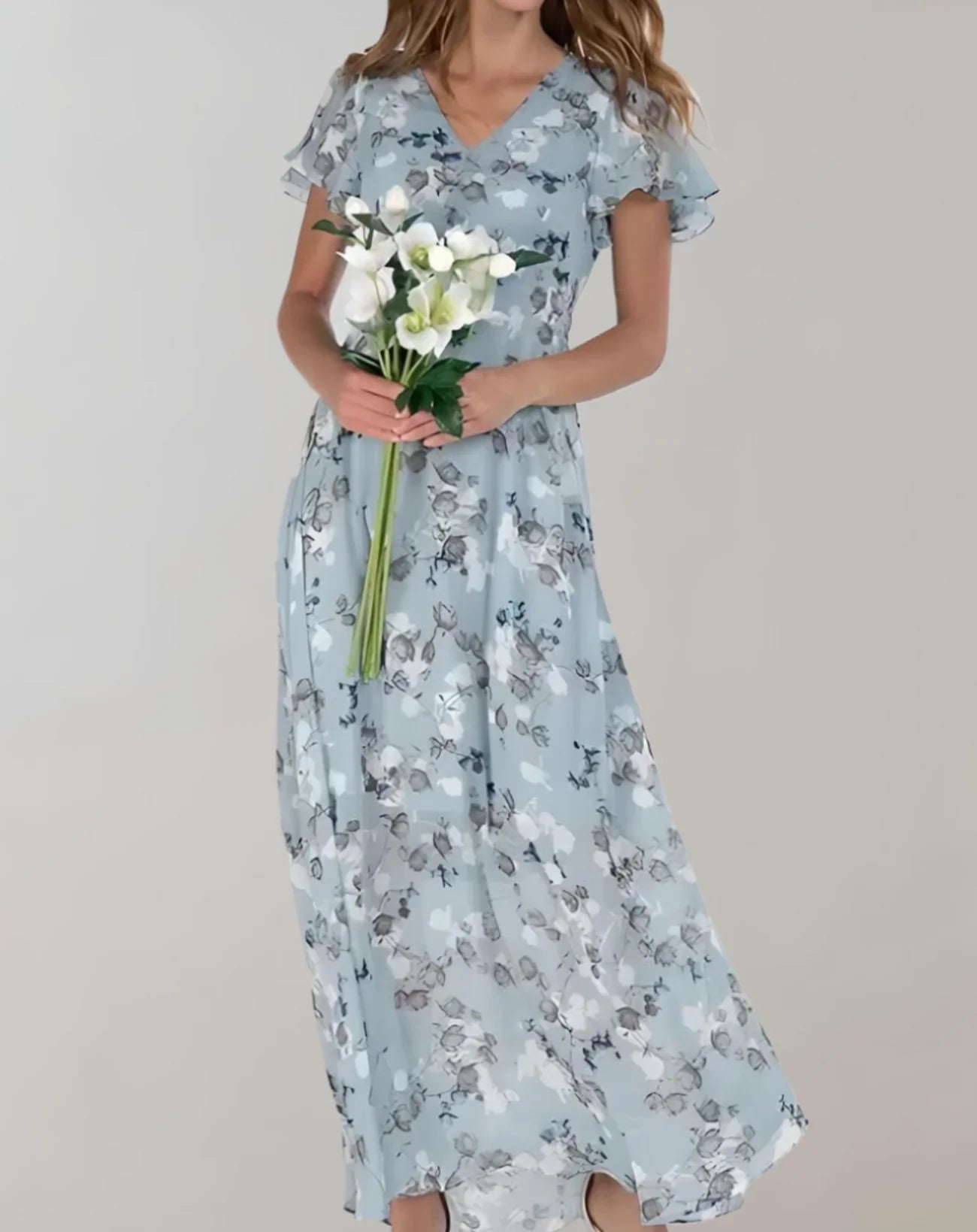 Questo abito floreale e fluente è realizzato in un leggero tessuto di chiffon e presenta una delicata sovrapposizione semitrasparente per un look etereo. L'abito ha maniche a sbuffo, un'elegante scollatura a V e una vita aderente che sfocia in una graziosa gonna lunga fino al pavimento.