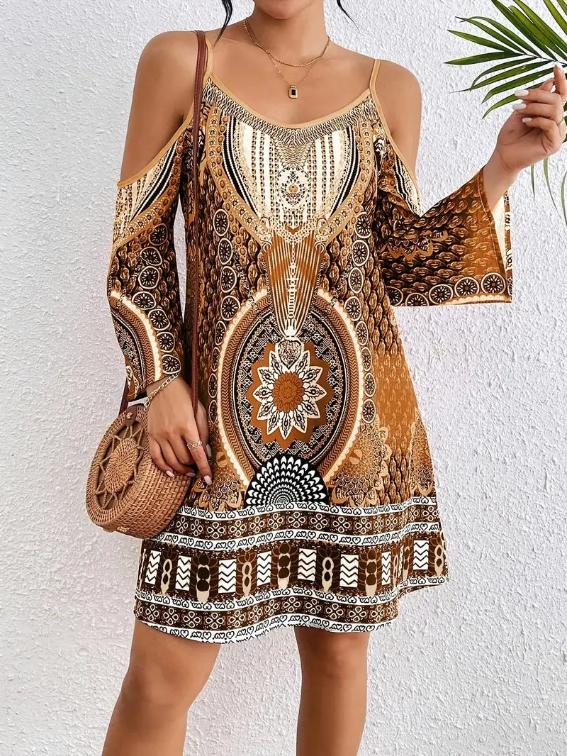 Create un'atmosfera boho-chic senza sforzo con questo splendido mini abito con spalle fredde. Con la sua intricata stampa tribale nelle calde tonalità della terra, questo abito è un pezzo forte per ogni occasione.