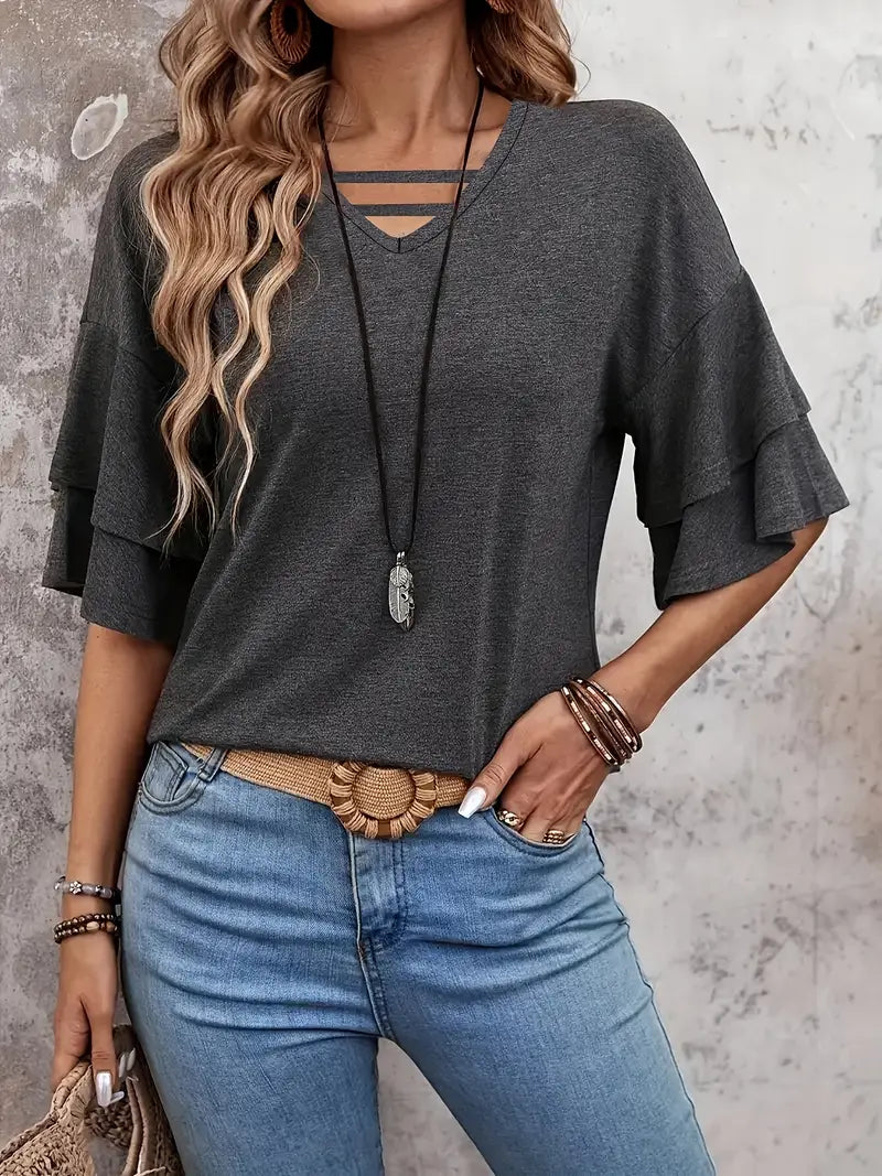 Le maniche a balze a strati conferiscono al top un tocco chic e femminile, rendendolo perfetto da abbinare a jeans o pantaloni sartoriali. Versatile, è un must per ogni guardaroba, ideale per gite nel tempo libero, viaggi nel fine settimana o serate rilassanti.