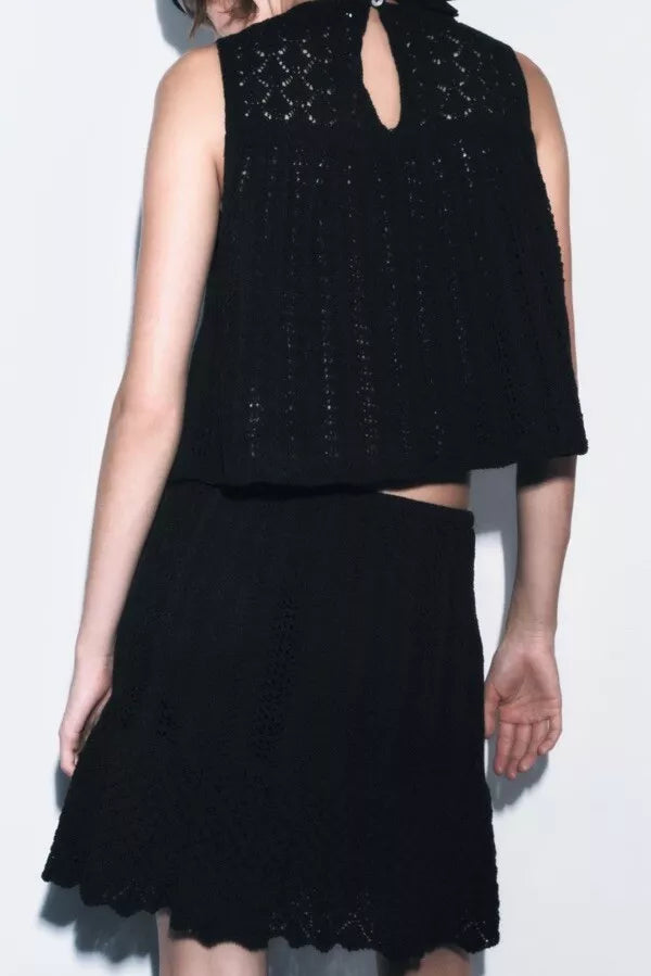 Questo set a due pezzi all'uncinetto è composto da un top senza maniche con scollatura alta e maglia aperta sul petto e sulle spalle, chiusura con bottoni a occhiello sul retro e vestibilità ampia e leggermente svasata per una sensazione di leggerezza.