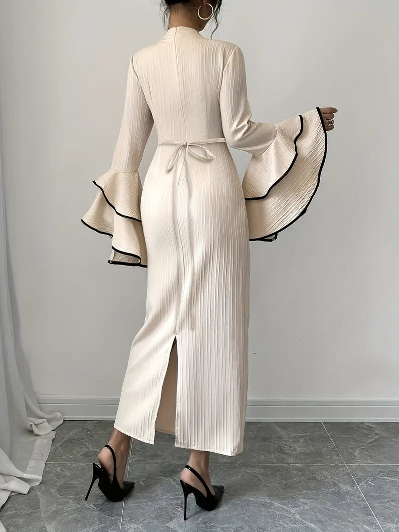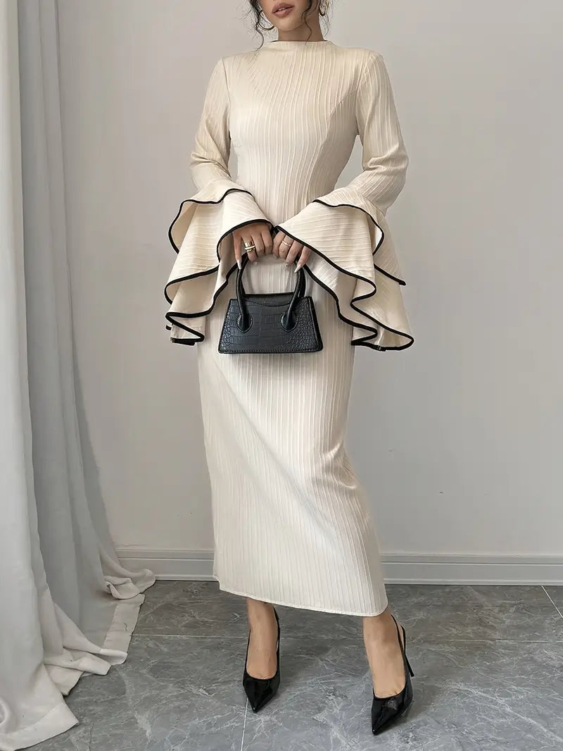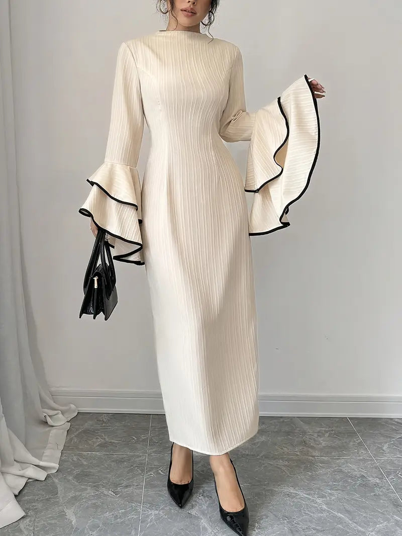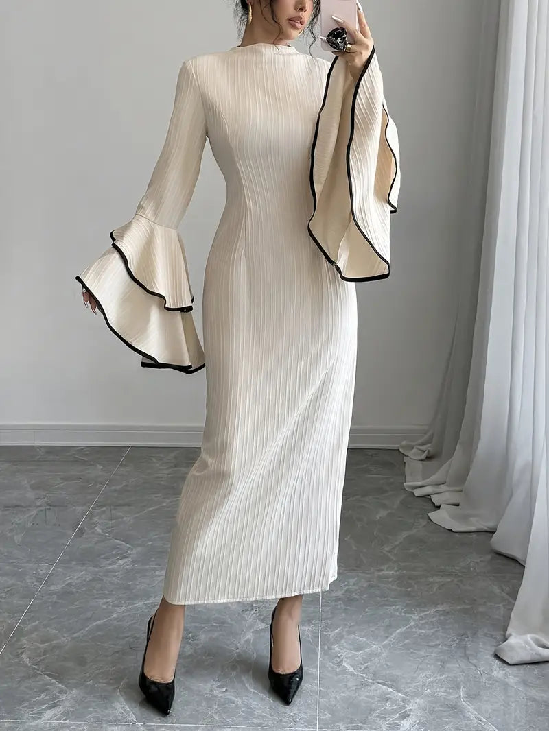 Questo elegante abito midi è realizzato in tessuto morbido, leggero e testurizzato per una vestibilità comoda e confortevole. Presenta una silhouette aderente con scollatura alta e maniche a campana increspate, accentuate da finiture nere a contrasto.