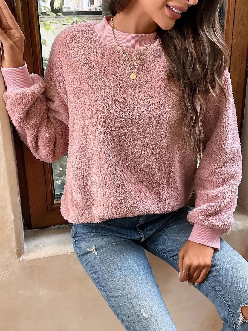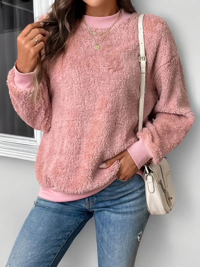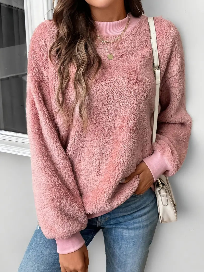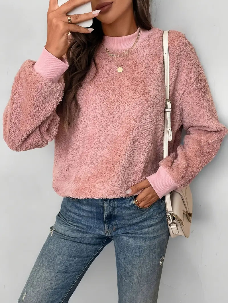 Questo accogliente maglione rosa è realizzato in shearling felpato e offre una consistenza morbidissima e un calore eccezionale. Ha una vestibilità ampia e presenta polsini e scollo a coste per un maggiore comfort e un look sottile e strutturato.