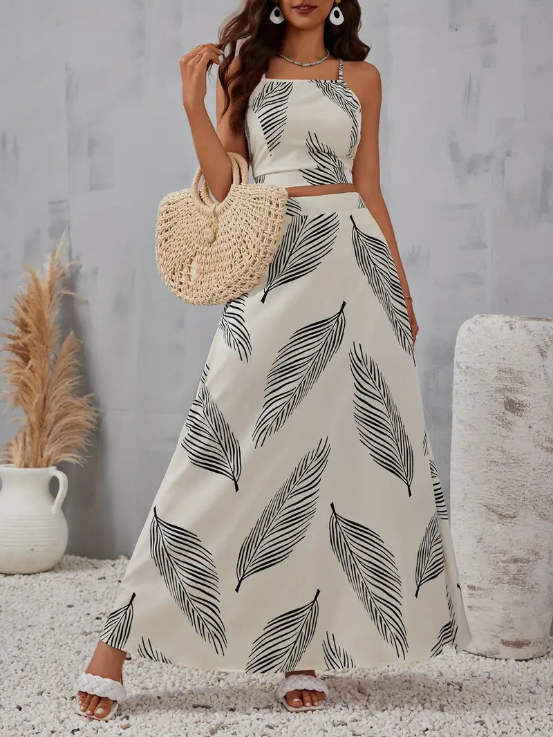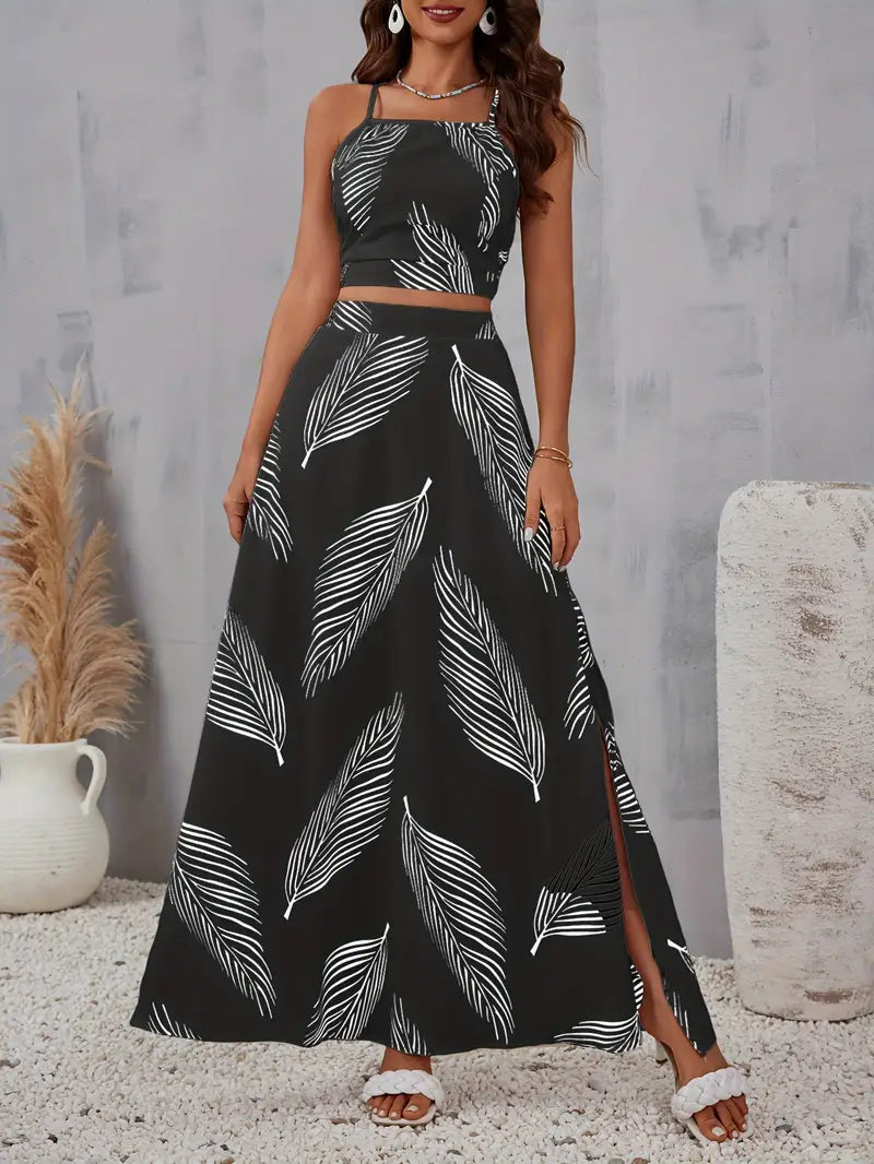 Questo set a due pezzi, composto da un crop top chic e da una maxi gonna fluida, è un vero e proprio eye-catcher . L'accattivante stampa a foglie conferisce all'outfit una moderna raffinatezza e un'ariosa eleganza. La schiena aperta con spalline aggiunge un tocco civettuolo, mentre la gonna con spacco alto consente maggiore movimento e stile.
