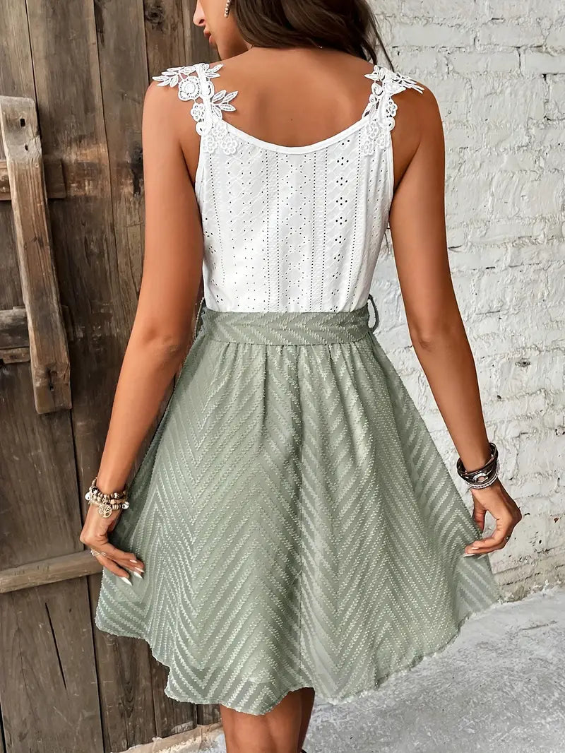 La gonna è realizzata in chiffon o tessuto simile al crêpe con un sottile motivo chevron intrecciato, che scorre delicatamente e aggiunge una morbida lucentezza. È foderata e ha una fusciacca abbinata nello stesso tessuto che stringe la vita e modella la silhouette. Il mix di texture e morbidezza dei materiali rende questo abito un compagno perfetto per gli eventi estivi, le vacanze o le gite di un giorno.