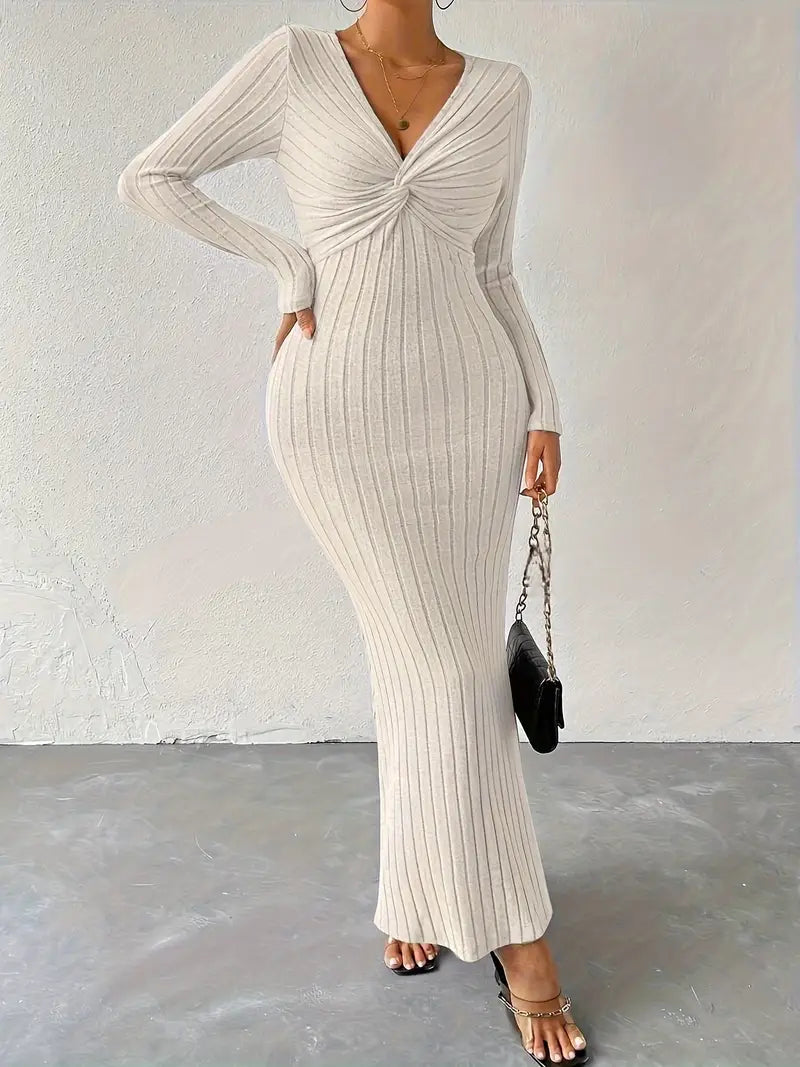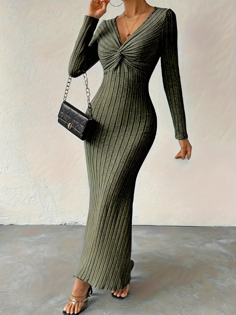 Questo maxi abito chic in maglia a coste elasticizzata abbraccia il corpo per una vestibilità lusinghiera e aderente alle curve. Con il suo fronte attorcigliato e la profonda scollatura a V, vi dà un tocco elegante e femminile, perfetto per le serate fuori o le occasioni speciali.