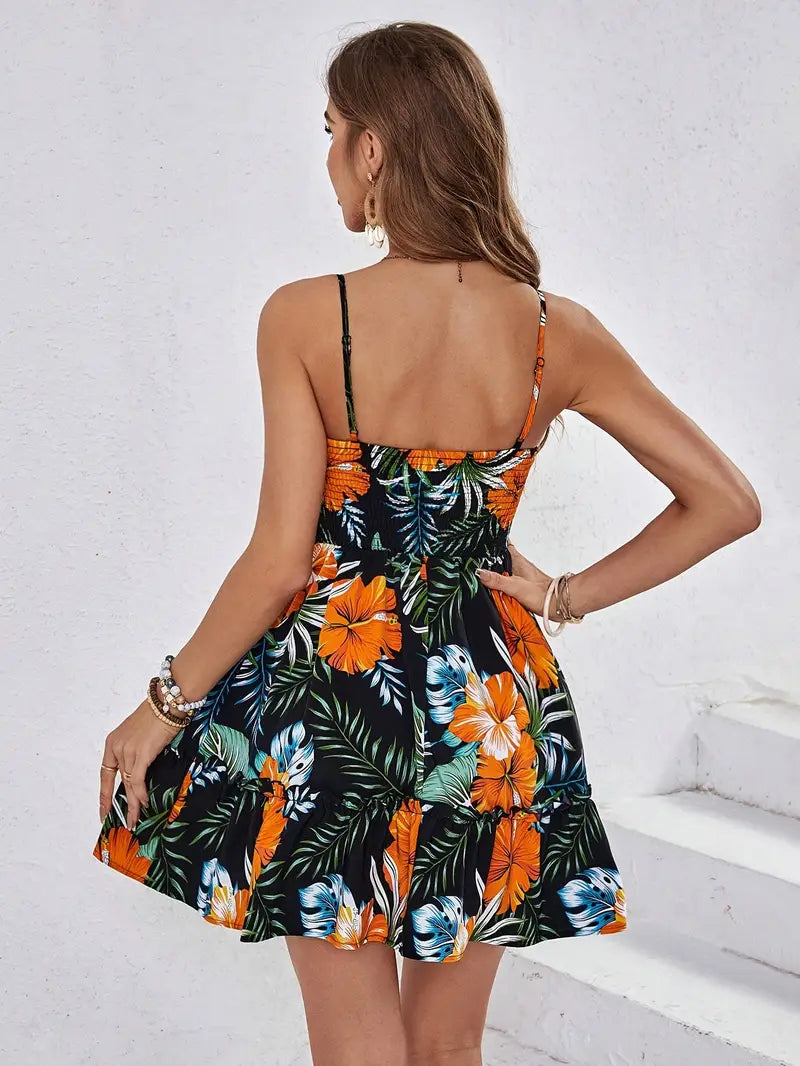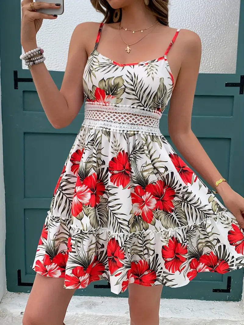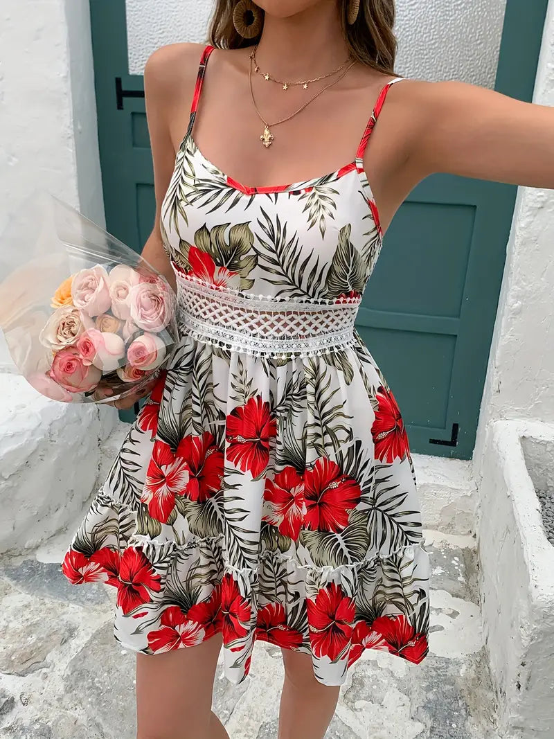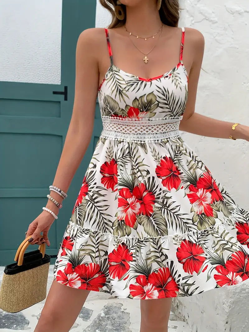 Questo abito estivo con stampa tropicale è il compagno ideale per una vacanza senza sforzo. È decorato con vivaci fiori di ibisco e motivi di foglie , ha spalline regolabili e una vestibilità lusinghiera con svasatura. Il dettaglio che salta all'occhio è l'ampia fascia all'uncinetto che stringe la vita e crea una forma femminile e civettuola, mentre l'orlo arricciato aggiunge un tocco giocoso.