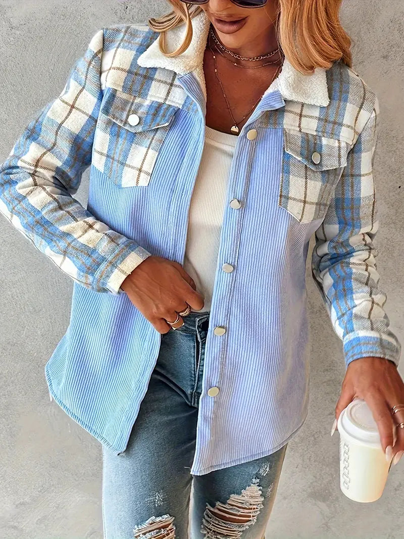 Questa accogliente giacca combina la flanella a quadri e il velluto a coste per un look unico ed elegante. Realizzata in morbido e traspirante tessuto di misto cotone, presenta una chiusura a bottoni, due tasche sul petto e un caldo colletto foderato in sherpa per un maggiore comfort.