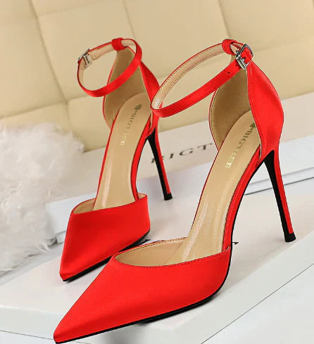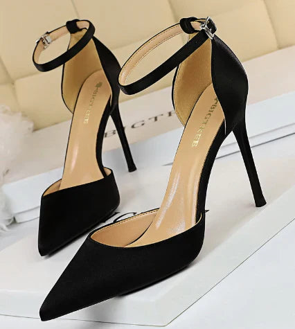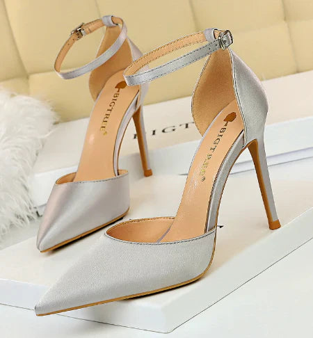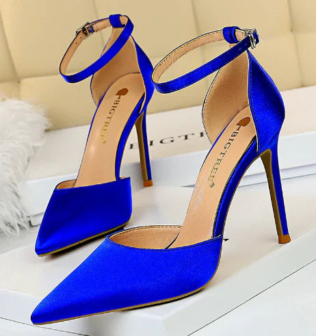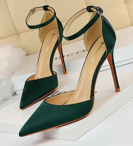Questi splendidi tacchi a spillo in raso faranno girare la testa. Presentano un'elegante punta a punta, un cinturino alla caviglia con chiusura a fibbia e un tacco alto che allunga le gambe e crea una silhouette sofisticata.