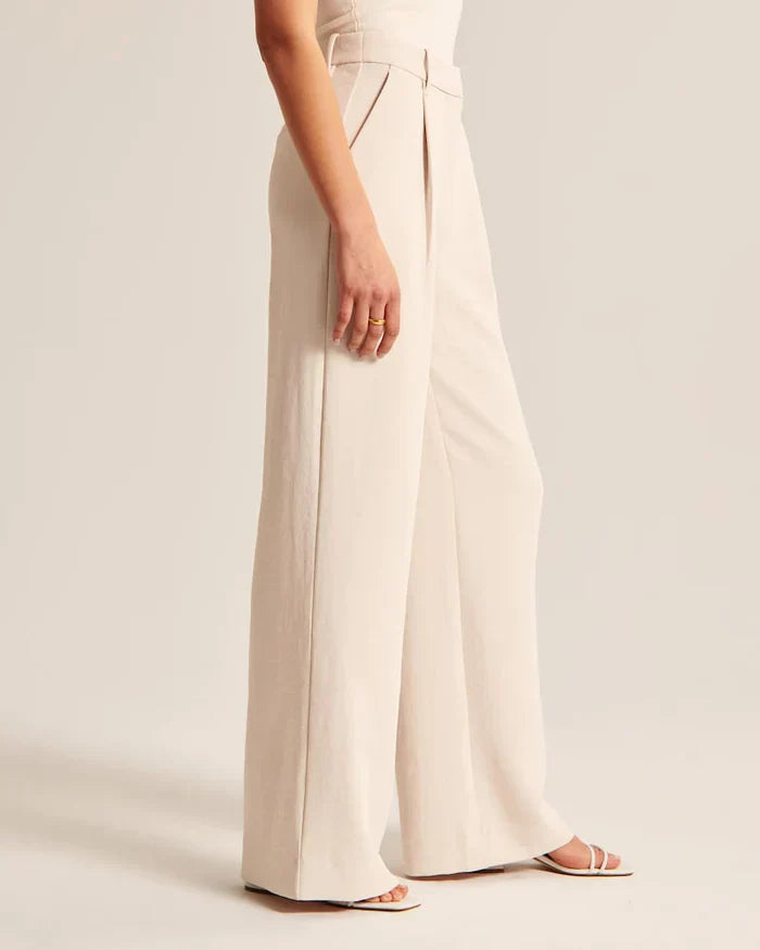 Questi pantaloni a gamba larga color crema offrono raffinatezza e comfort allo stesso tempo. Il taglio a vita alta con pieghe sul davanti crea una silhouette lusinghiera che allunga le gambe .