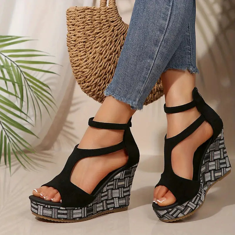 I morbidi cinturini in finto camoscio avvolgono saldamente la caviglia con una chiusura a fibbia, offrendo eleganza e stabilità. Con il loro tacco a zeppa e la soletta imbottita, assicurano un comfort duraturo sia che siate fuori per un brunch, in vacanza o a ballare.
