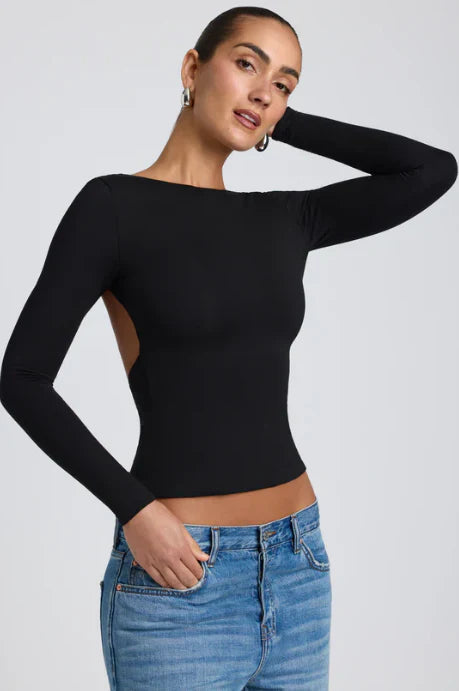 Questo top chic è realizzato in una miscela elastica e liscia di tessuti di alta qualità che offre una vestibilità aderente alla pelle. Il design è caratterizzato da una sottile scollatura rotonda e da maniche lunghe, completate da una seducente schiena aperta per un accento audace e moderno.