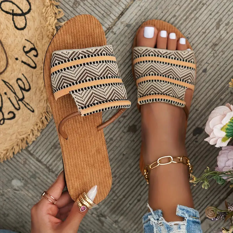 Con questi sandali intrecciati con cinturini in stile boho-chic, avrai un look estivo senza sforzo. Queste scarpe basse con comodo design a slittamento sono decorate con elaborati motivi geometrici che aggiungono un tocco di fascino artigianale. La doppia costruzione a cinturino garantisce una calzata sicura, mentre il plantare imbottito assicura comfort per tutto il giorno.