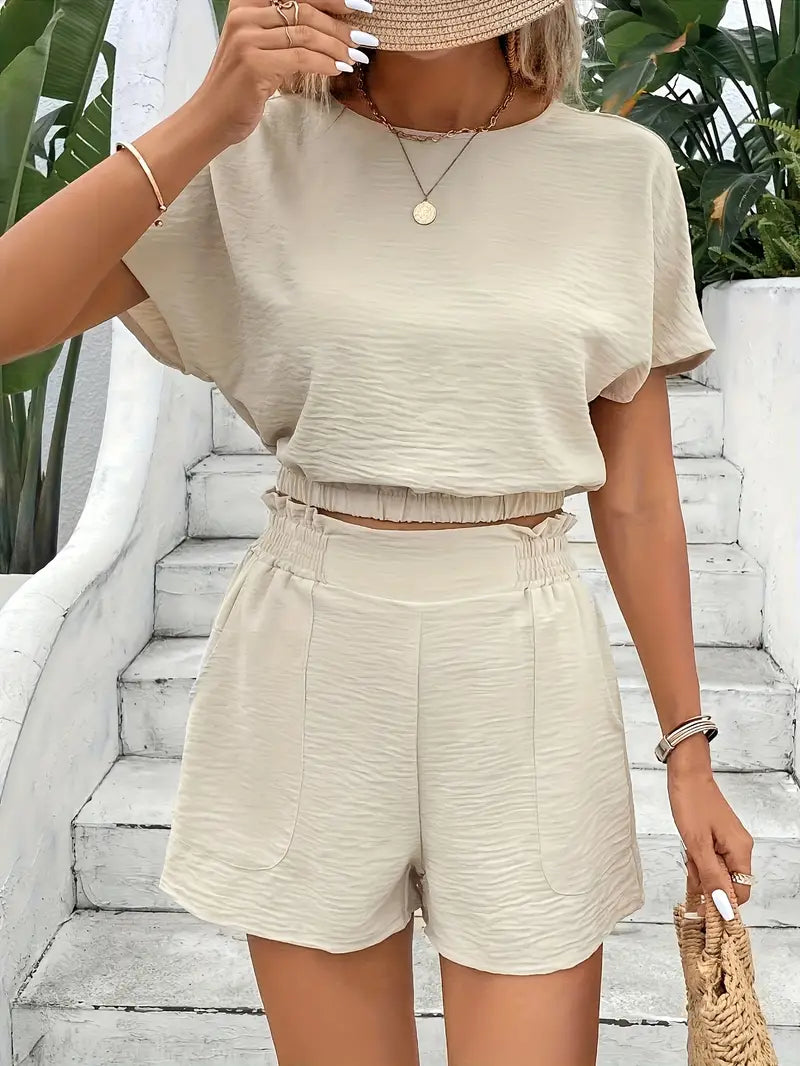 Il top aderente ha una vestibilità rilassata con maniche lunghe e un orlo elasticizzato e arricciato che si abbina perfettamente ai pantaloncini a vita alta, che offrono comfort e stile grazie agli ampi polsini smocked e alle pratiche tasche ( ). A casa o durante una passeggiata estiva, questo look combina un minimalismo chic e un'atmosfera accogliente.