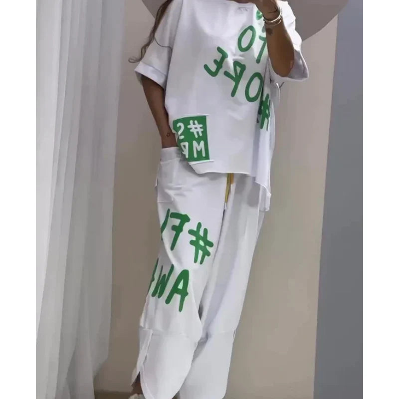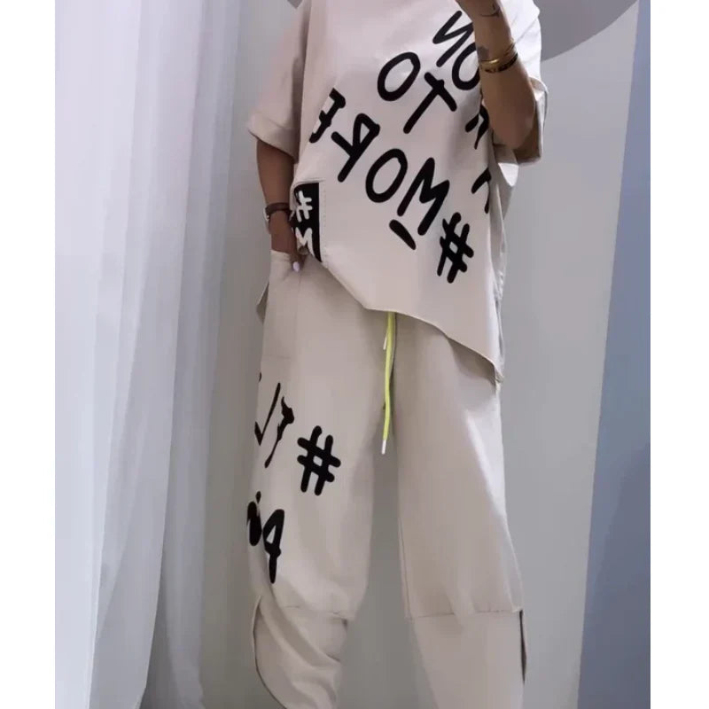 Questo set a due pezzi di tendenza è realizzato in un misto cotone morbido e traspirante che vi terrà a vostro agio per tutto il giorno. Il top oversize a maniche corte e i pantaloni a gamba larga sono caratterizzati da scritte grafiche in grassetto per un look elegante di ispirazione streetwear.
