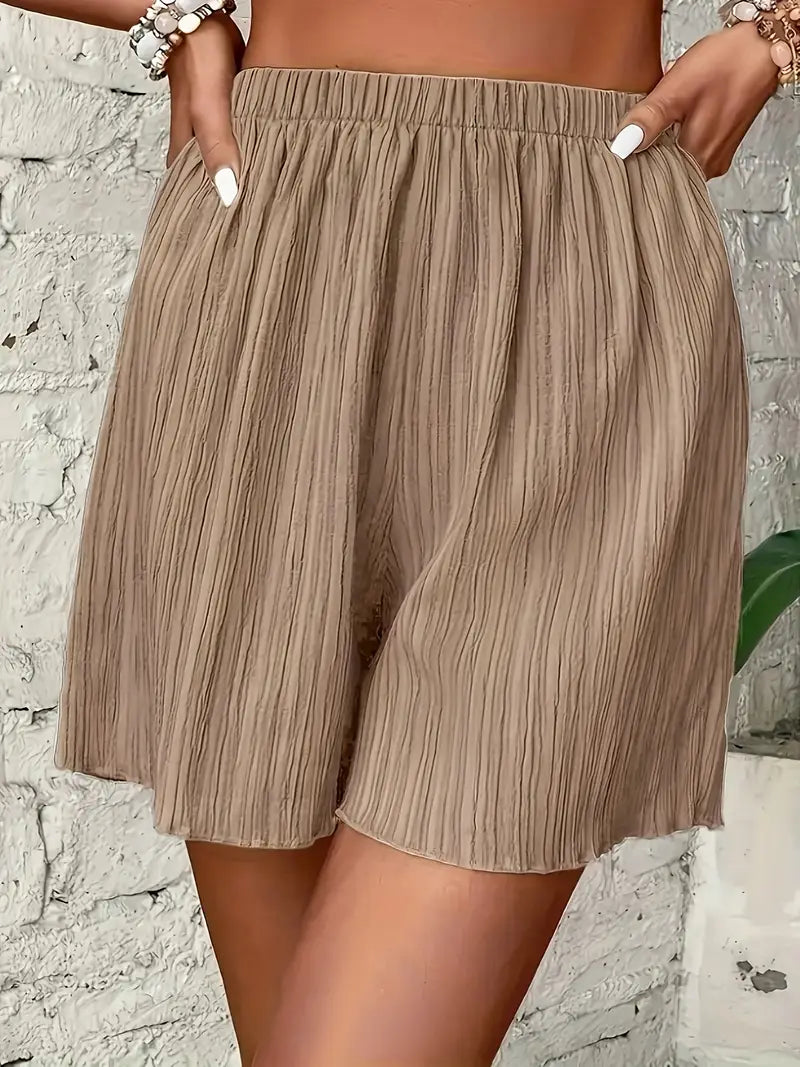 Mantieni lo stile senza sforzo con questi pantaloncini leggeri piegati. Con una vestibilità rilassata e una cintura elastica per il massimo comfort, questi pantaloncini ariosi sono perfetti per le giornate calde.
