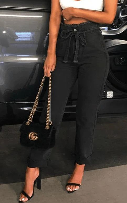 Ravvivate il vostro look casual con questi pantaloni in denim a vita alta. Questi jeans in denim con cintura lusinghiera e cintura rimovibile combinano il comfort classico con un tocco moderno. La gamba affusolata e la lunghezza che scende fino alla caviglia li rendono perfetti da abbinare a scarpe da ginnastica, tacchi o sandali.
