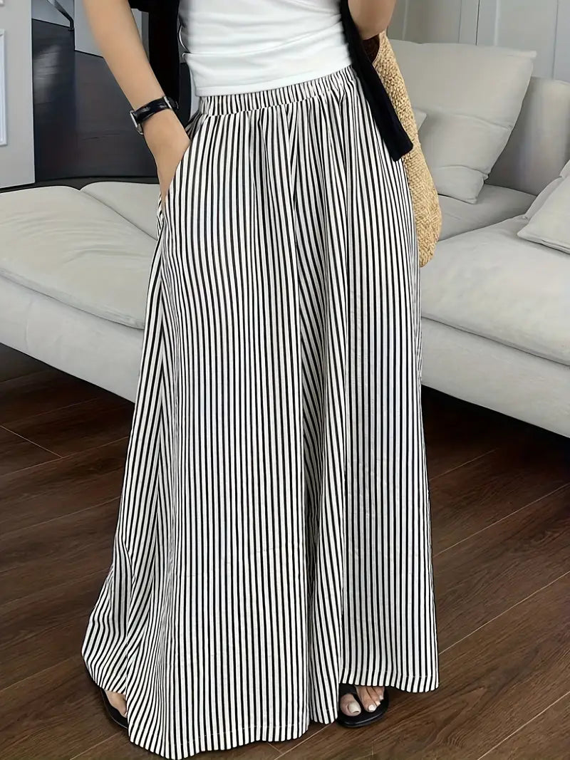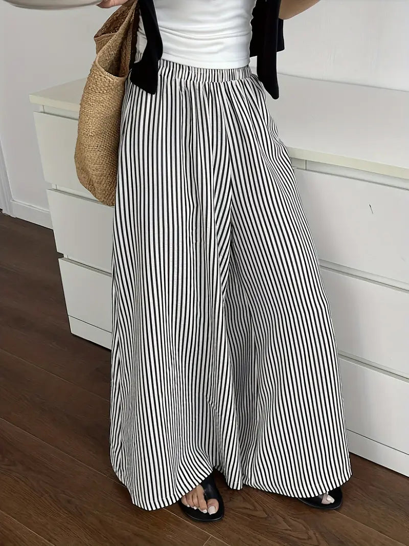 Rinnova il tuo guardaroba per il tempo libero con questi pantaloni palazzo a gamba larga, chic e facili da indossare. Con un classico motivo a righe bianche e nere, questi pantaloni fluidi creano un effetto allungante e lusinghiero. Con una comoda cintura elastica, offrono una vestibilità leggera perfetta per tutto il giorno.