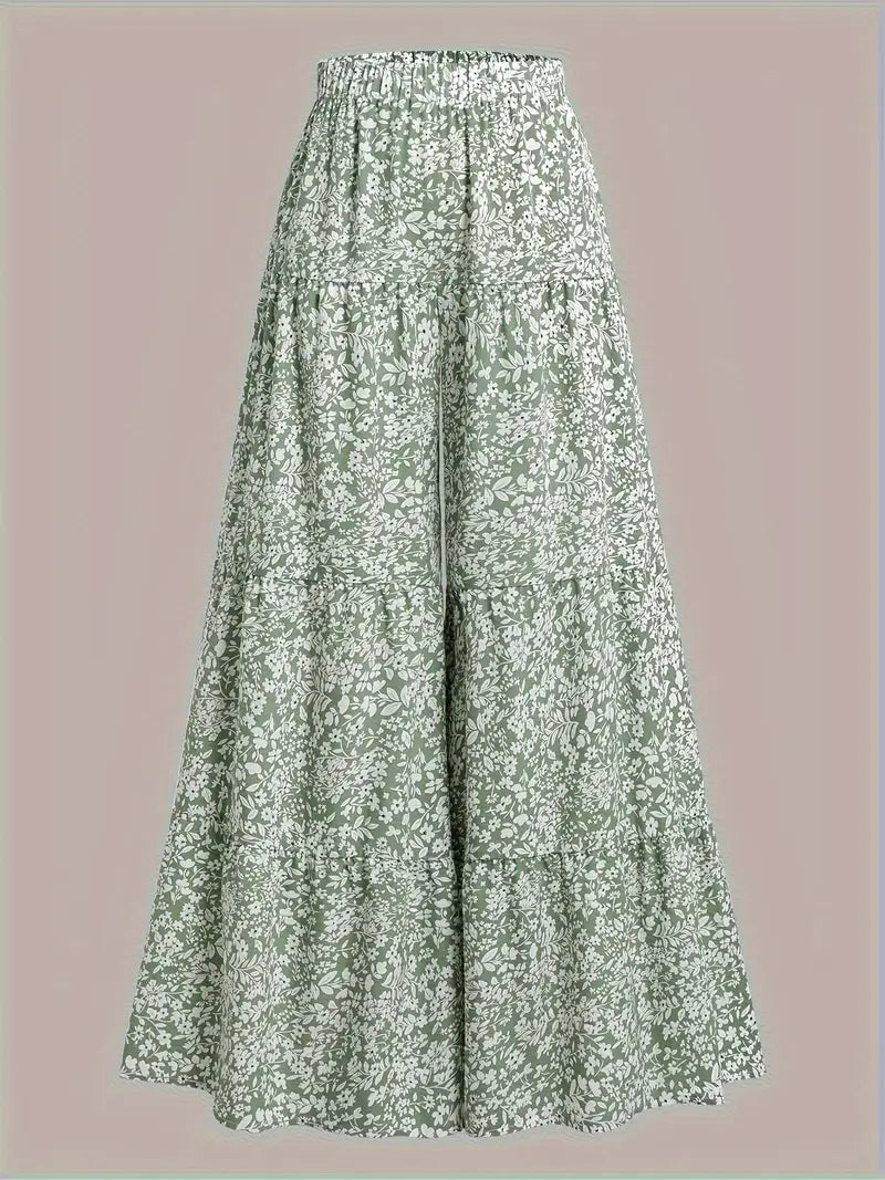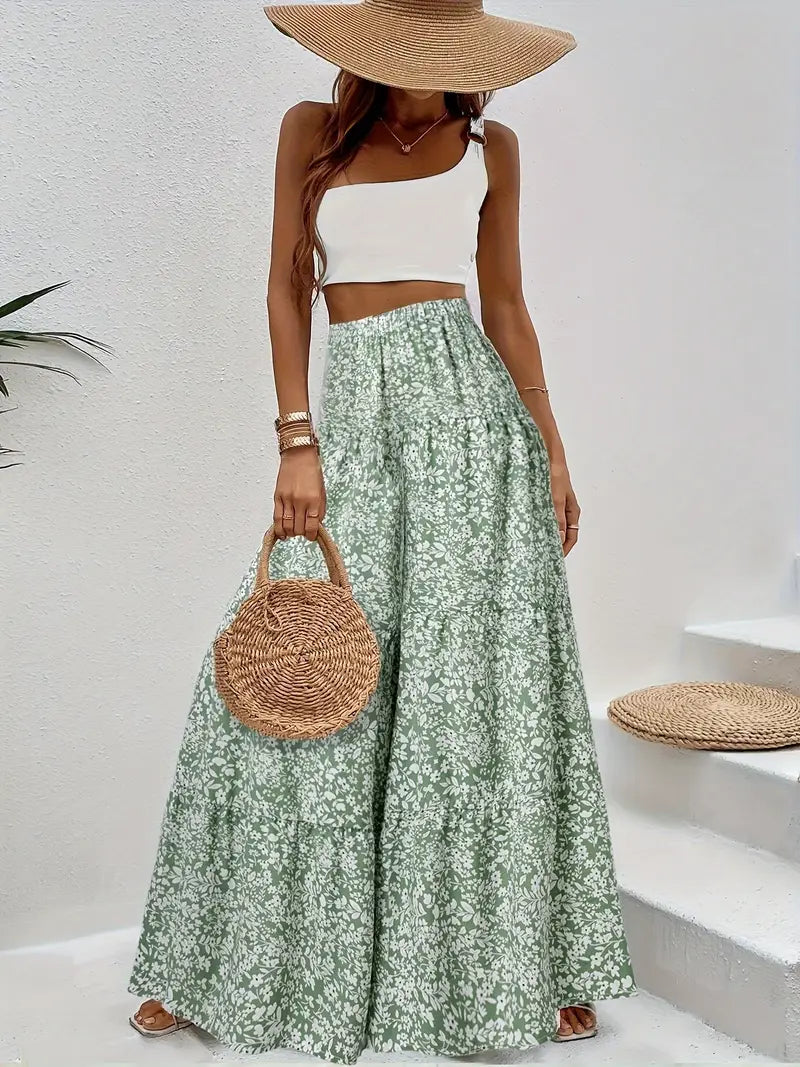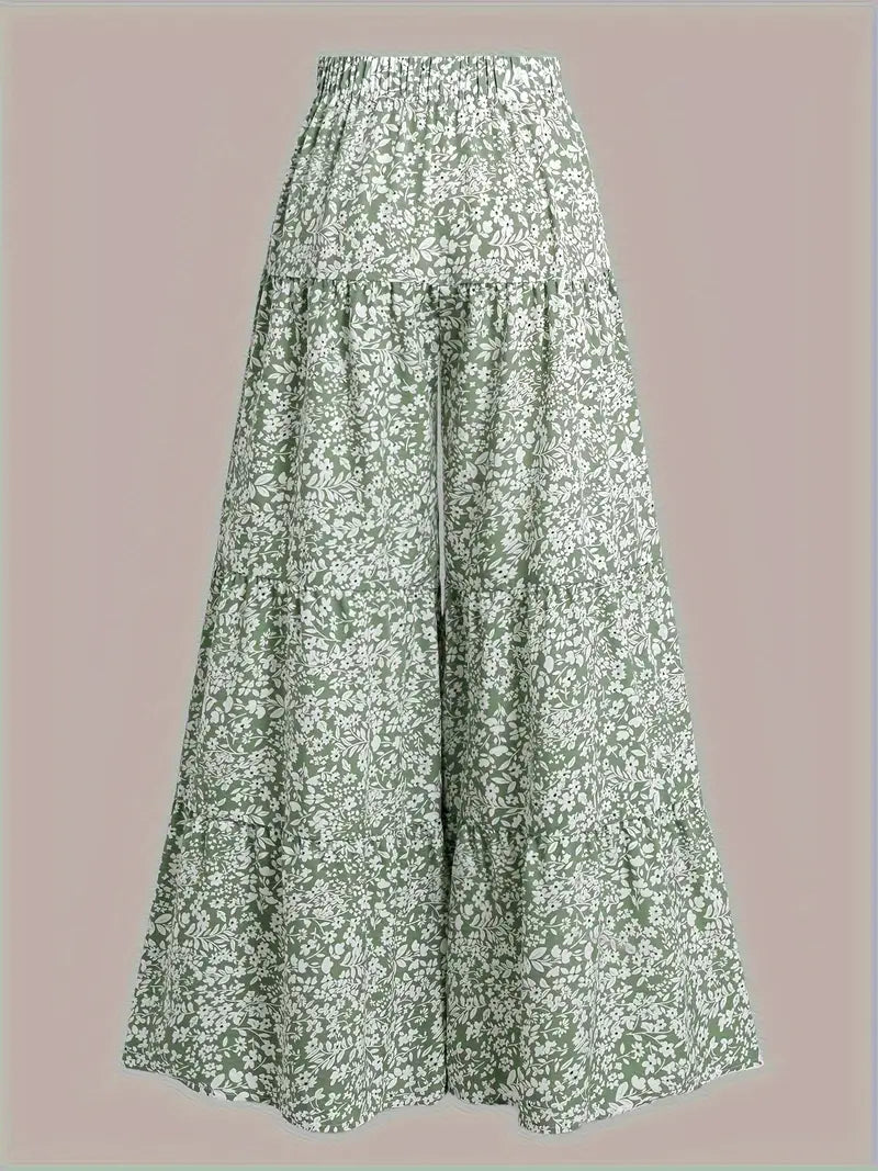 I pantaloni palazzo a vita alta con gamba larga e stampa floreale vi accompagneranno nelle giornate calde con stile. Con la loro silhouette morbida e fluida e l'affascinante stampa floreale verde, questi pantaloni combinano l'eleganza di una gonna con il comfort di un pantalone.