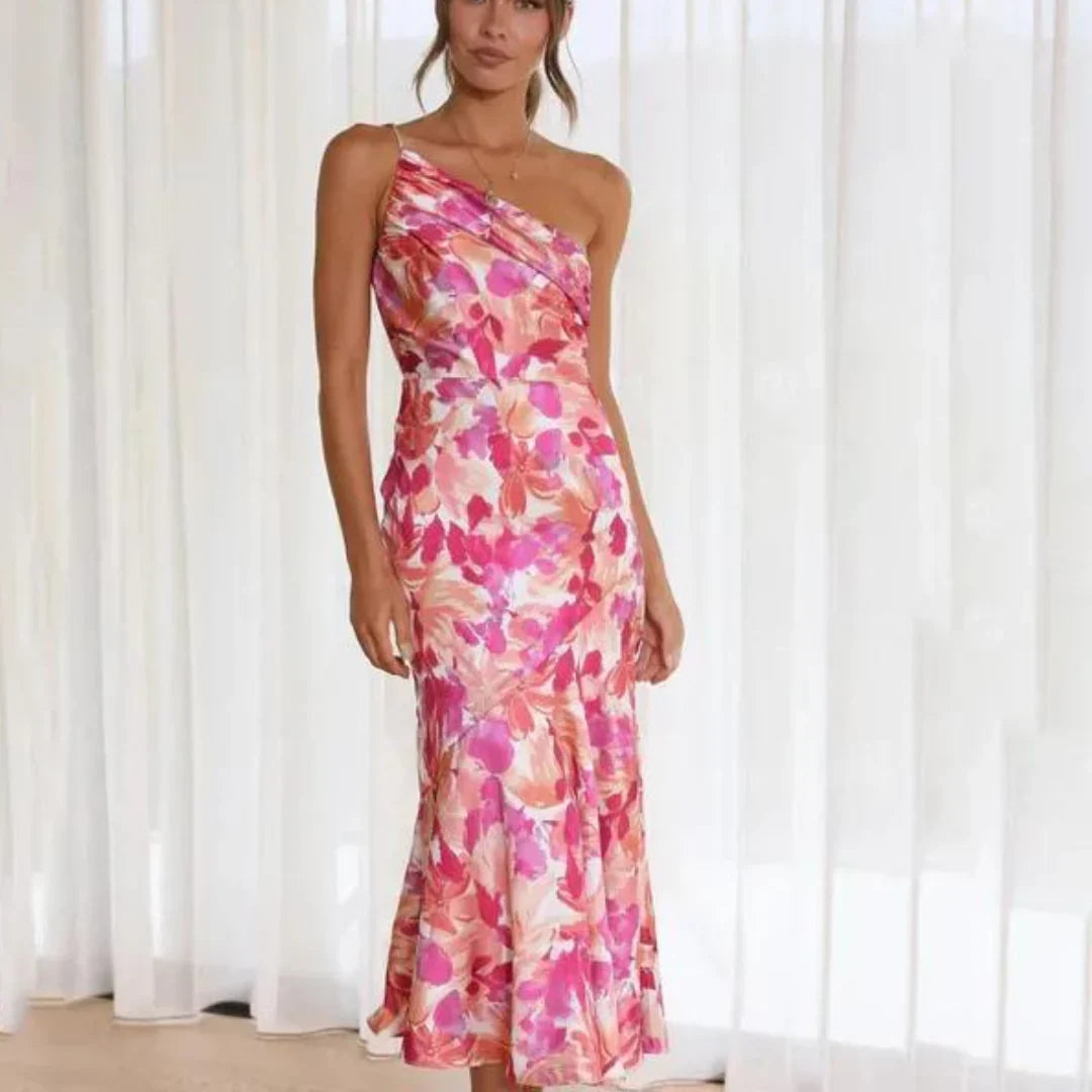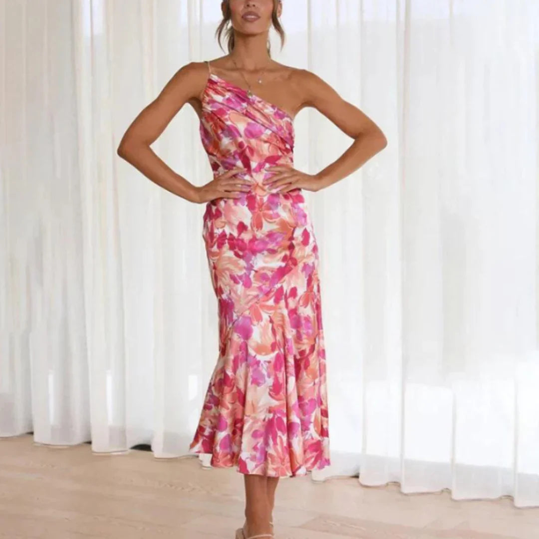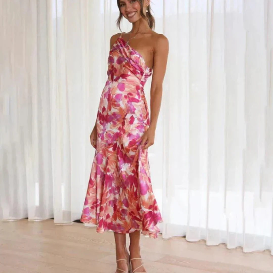 Irradia fiducia in te stessa e femminilità con questo abito midi monospalla in raso floreale che valorizza le tue curve con eleganza e leggerezza. L'abito è realizzato in raso setoso di alta qualità ed è stampato con una vivace fantasia floreale in rosa e corallo, che offre un accento colorato per ogni occasione.