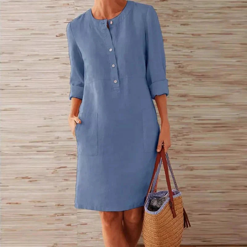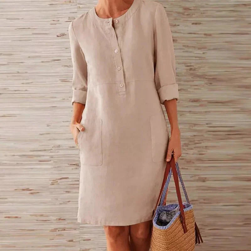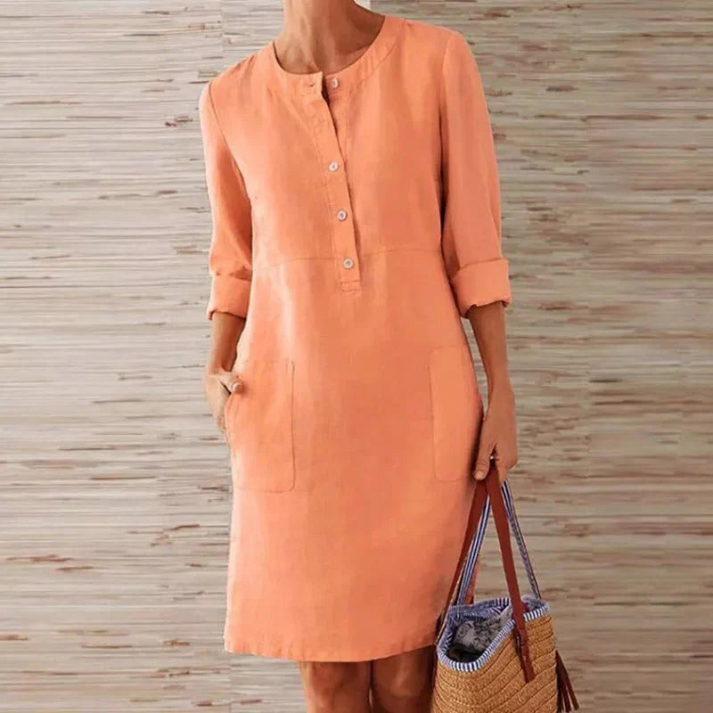 Questi abiti in lino con chiusura a bottoni sono chic e traspiranti,adatti a giornate rilassate con un tocco di eleganza. Caratterizzati da scollo rotondo, maniche di media lunghezza con polsini arrotolabili e ampie tasche applicate, offrono comfort e funzionalità.