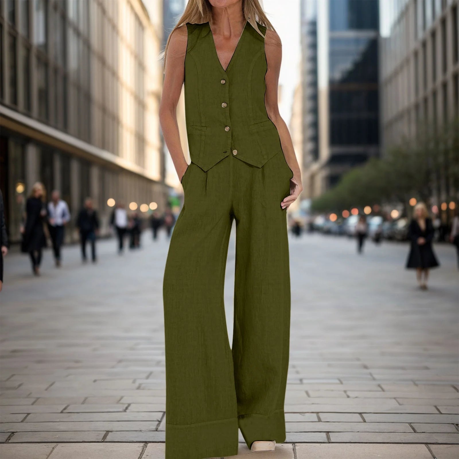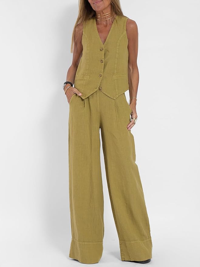 Questo elegante abito a due pezzi in lino è realizzato in misto lino traspirante e leggero per un look rilassato ma sofisticato. Il gilet senza maniche ha una vestibilità strutturata con un'abbottonatura sul davanti e sottili dettagli delle tasche per un look sartoriale e raffinato. Abbinato a pantaloni a vita alta e a gamba larga, il set assicura un movimento senza sforzo e una silhouette allungata.