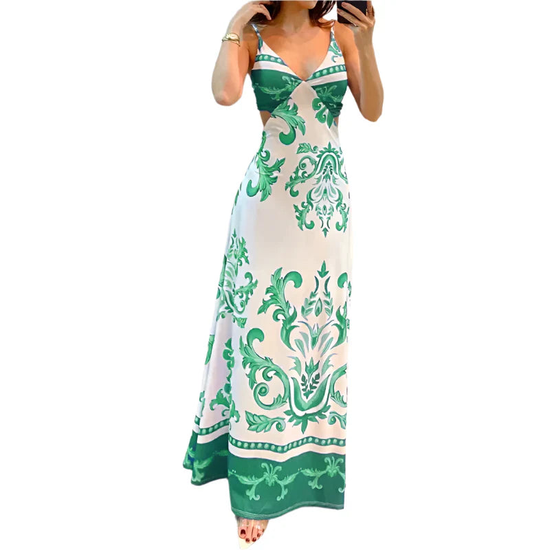 Con le sue delicate spalline e il corpetto increspato, l'abito offre una vestibilità perfetta e affascina con la sua attenzione ai dettagli sia nella costruzione che nella stampa. Che stiate passeggiando sulla spiaggia o partecipando a un evento estivo, questo abito promette comfort e raffinatezza a ogni passo.