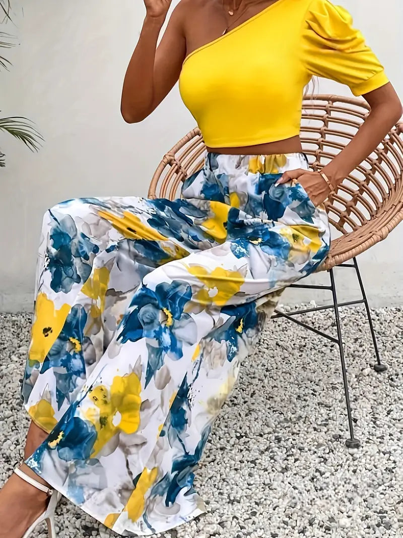 Ravviva il tuo guardaroba con questi vivaci pantaloni a gamba larga con motivo floreale! Con una vistosa stampa ispirata all'acquerello in tonalità luminose di giallo, blu e bianco, questi pantaloni fluidi sono perfetti per le uscite quando fa caldo.