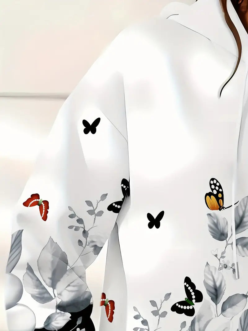 Questa felpa artistica con cappuccio è realizzata in un tessuto misto di alta qualità, morbido e traspirante , che garantisce comfort e durataper tutto il giorno. Il punto forte è la vivace stampa floreale e a farfalla che passa dal nero al bianco sull'orlo, creando un accattivante effetto ombreggiato.