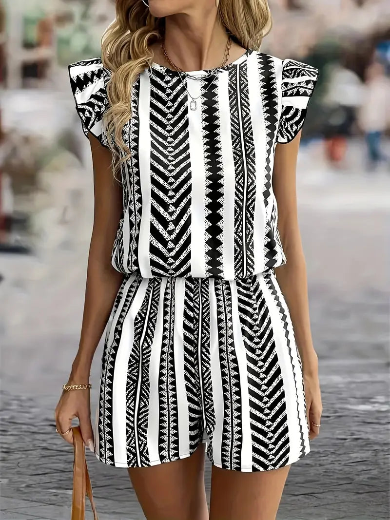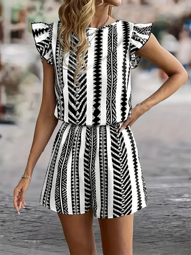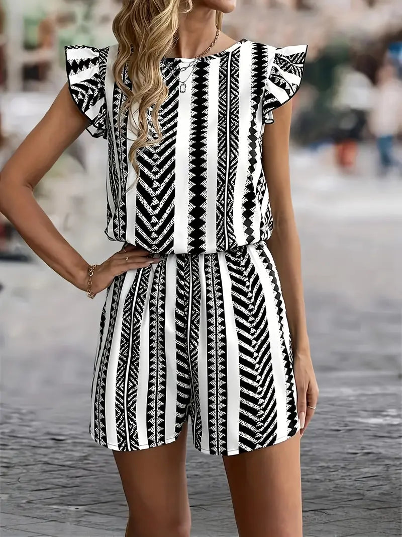 Fresca, giocosa ed elegante senza sforzo, questa tutina stampata in bianco e nero è perfetta per le giornate di sole e le avventure più spontanee. Con le sue accattivanti strisce in stile tribale, le maniche a sbuffo e la vita aderente per una vestibilità perfetta, è un vero e proprio eye-catcher e facile da indossare.