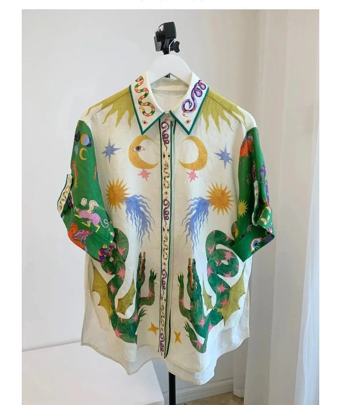 Questo set a due pezzi con stampe vivaci è una combinazione sorprendente di arte e comfort . è composto da una camicia button-up a maniche corte e da pantaloncini a vita alta abbinati . Il design si ispira a motivi celestiali e mistici , con sole, luna ed elementi astratti che aggiungono un tocco incantevole.