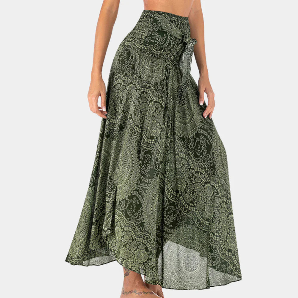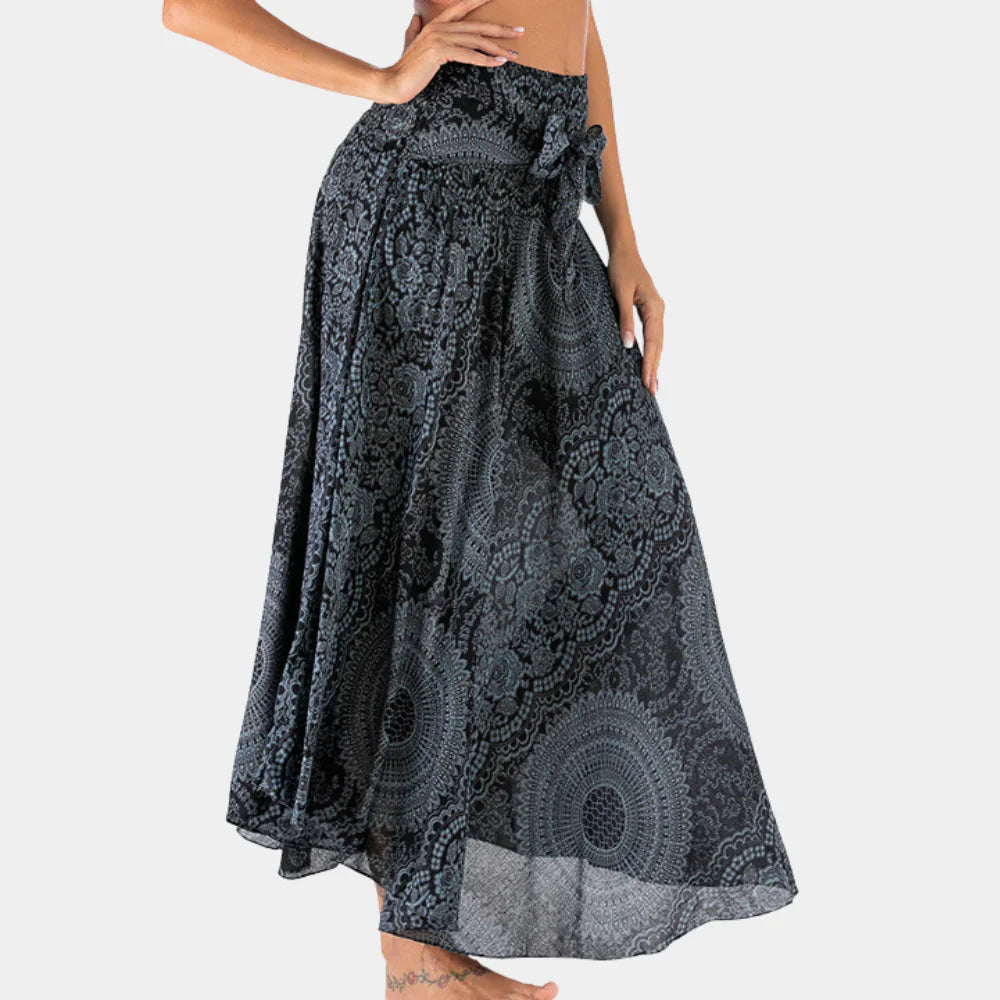 Realizzata in un tessuto misto leggero e traspirante, questa maxi gonna di ispirazione bohémien offre una silhouette fluida ed elegante, perfetta per la stagione calda. Caratterizzata da un'intricata stampa mandala e da un design lusinghiero a vita alta con cintura da annodare, questa gonna offre una vestibilità regolabile che migliora il comfort e lo stile .