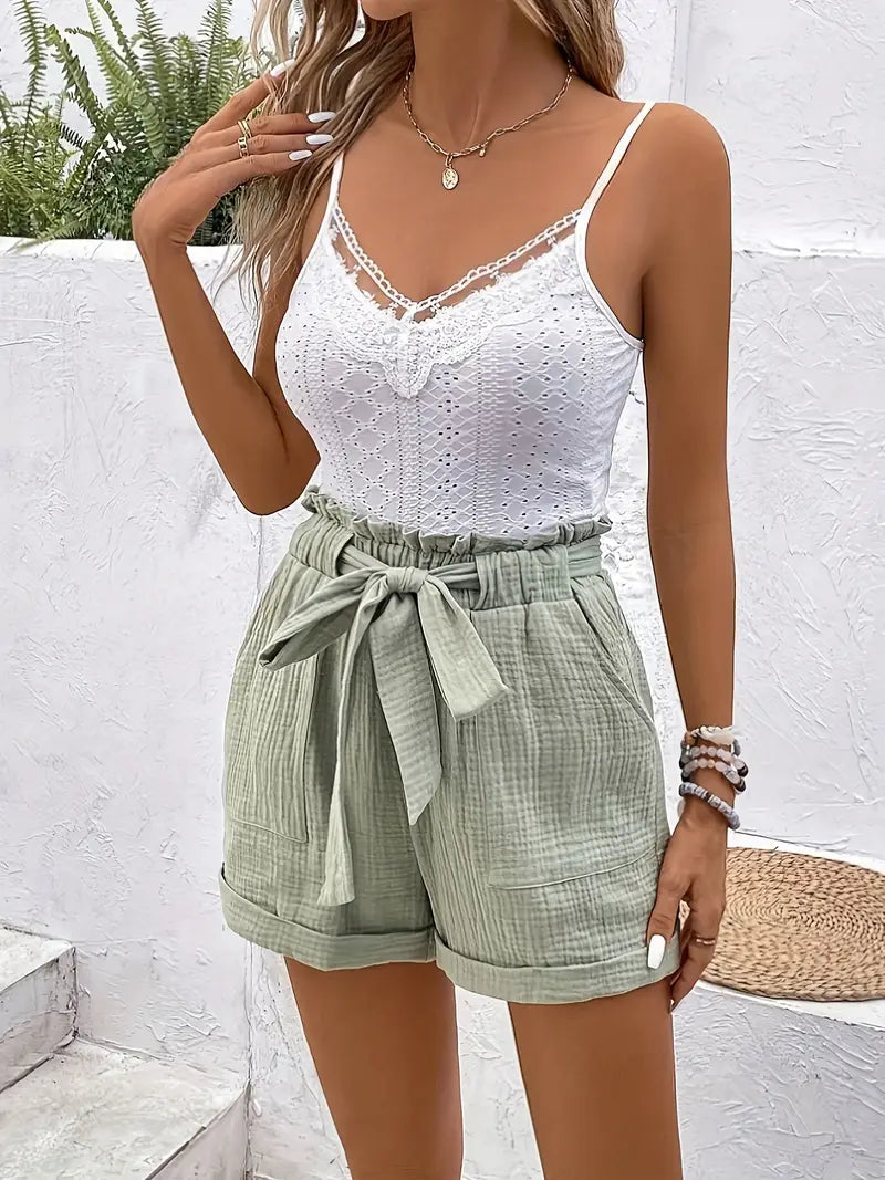 Rimanete fresche e senza sforzo con questo set estivo in due pezzi, che combina un delicato top cami in pizzo con pantaloncini paperbag a vita alta. Il top è realizzato in cotone traspirante con occhielli, spalline regolabili e finiture in pizzo per una finitura morbida e femminile.