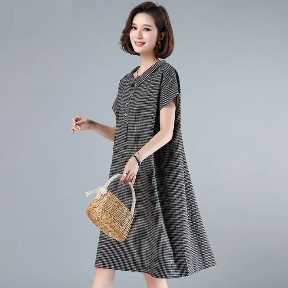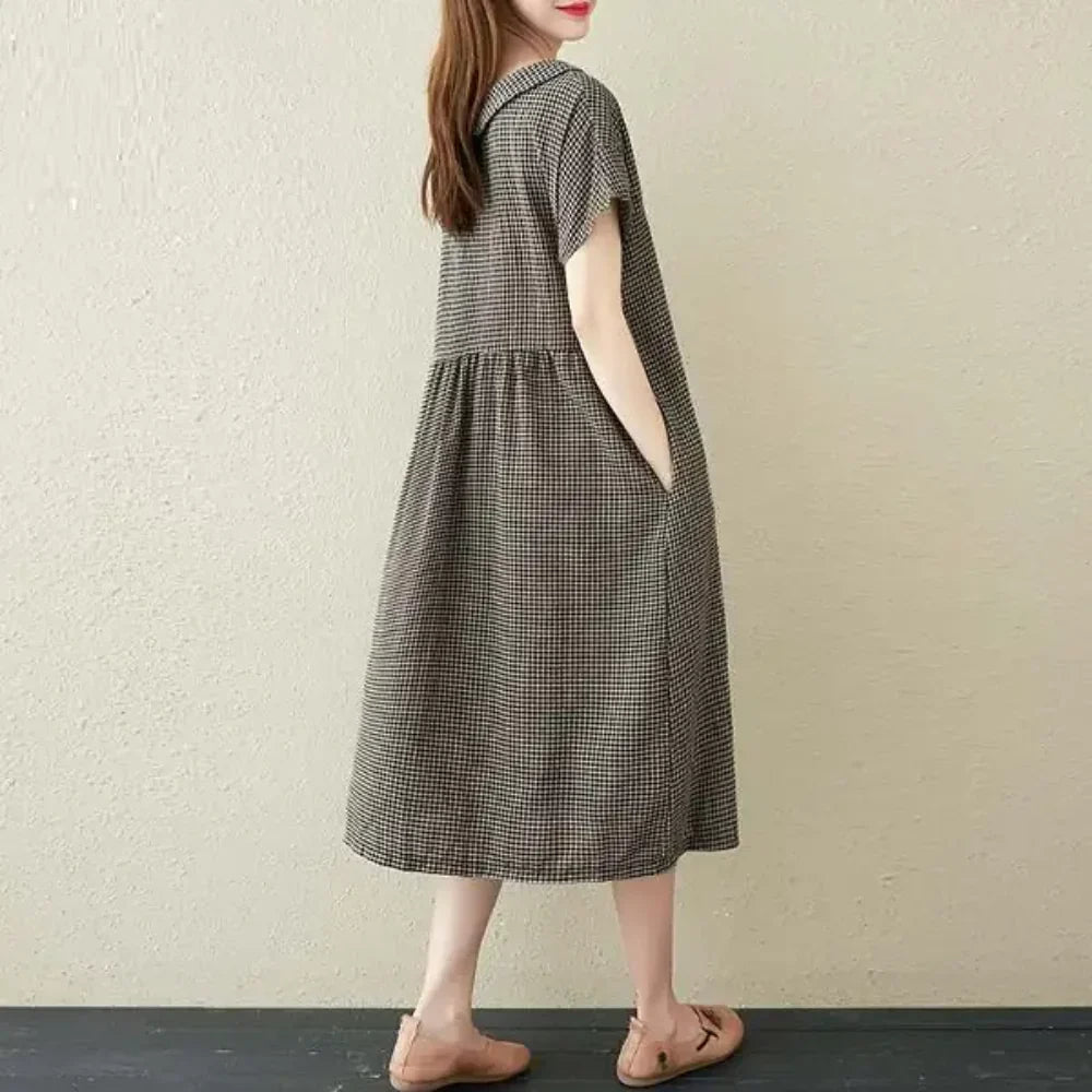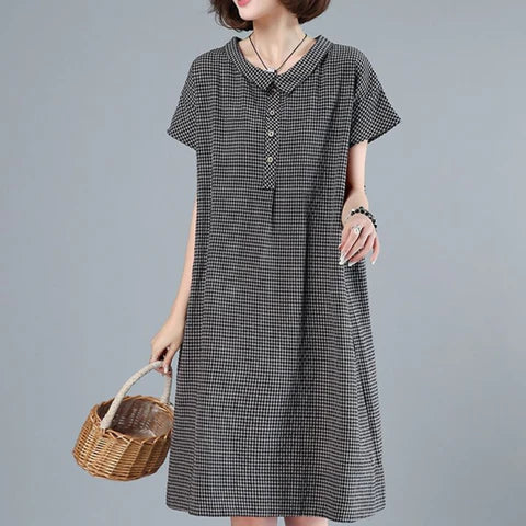 Questo affascinante abito a quadretti è realizzato in misto cotone e lino traspirante , leggero e arioso, perfetto per le stagioni più calde. Il tessuto è morbido, delicato sulla pelle e non elastico, ideale per un comfort casual senza compromettere la struttura. Ha una vestibilità ampia con maniche corte, un taglio rilassato che si adatta a diversi tipi di corpo, una chiusura frontale con bottoni per aggiungere dettagli e un grazioso colletto alla Peter Pan per un tocco vintage.