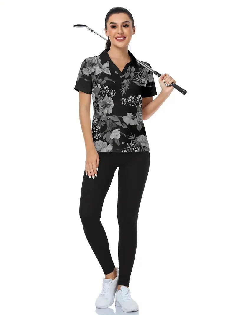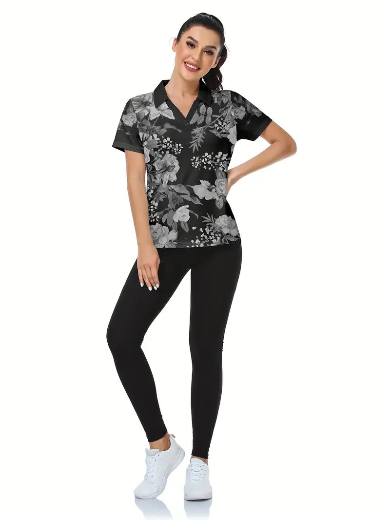 Aggiornate il vostro guardaroba casual con questa polo dall'eleganza disinvolta con motivo floreale. Con un'intramontabile scollatura a colletto e un'invitante scollatura a V, questo top a maniche corte combina eleganza e femminilità moderna. Il motivo floreale monocromatico gli conferisce un tocco chic e versatile, rendendolo perfetto per il lavoro e le uscite del fine settimana.